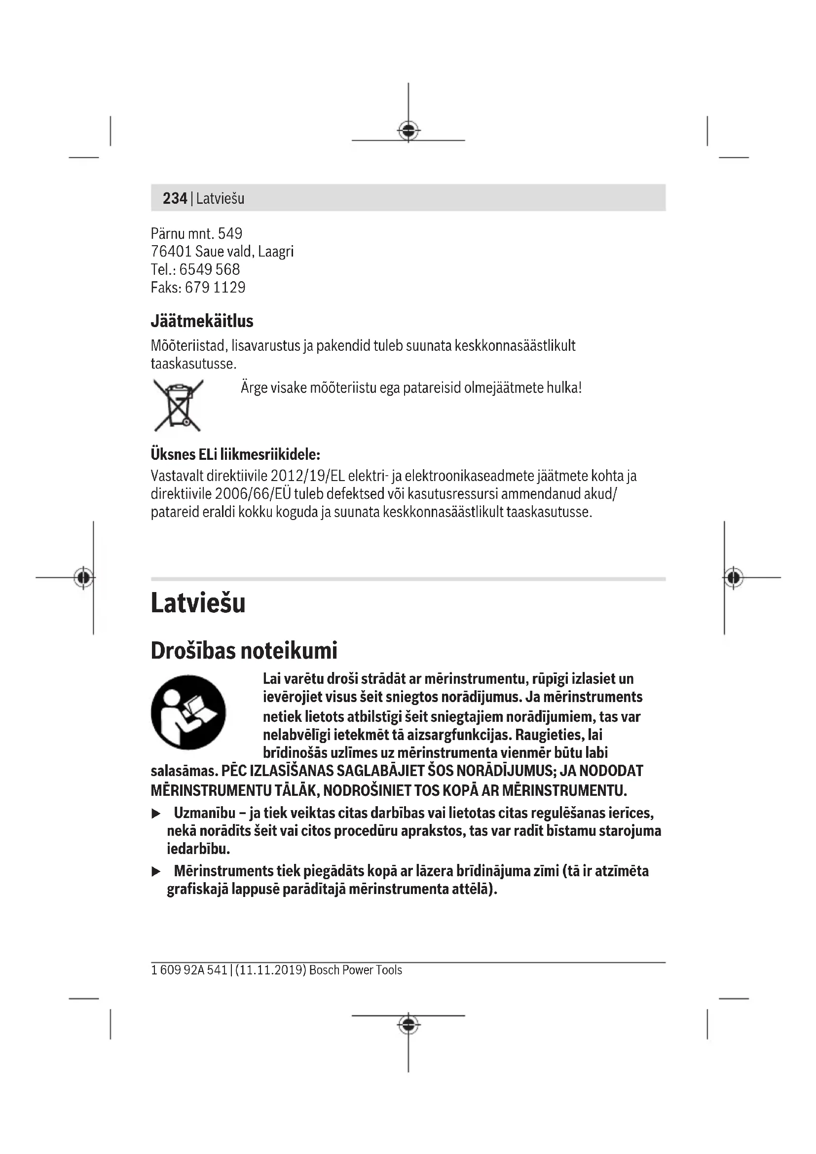 piei 20–25°C C) spēkā divos krustpunktos un pretējās pusēs D) Norādītās vērtības attiecas uz normāliem un labvēlīgiem apkārtējās vides apstākļiem (piemēram, nav vibrāciju, nav miglas, nav dūmu, nav tiešu saules staru). Ja ir ievērojamas temperatūras svārstības, mērinstruments var darboties neprecīzi. E) Piezīme: parasti ir vērojams tikai elektronenevadošs piesārņojums, taču dažkārt ir sagaidāma kondensācijas izraisītas pagaidu elektrovadāmības parādīšanās. Mērinstrumenta viennozīmīgai identifikācijai kalpo sērijas numurs (13), kas atrodams uz tā marķējuma plāksnītes. Montāža Bateriju ievietošana/nomaiņa Mērinstrumenta darbināšanai ieteicams izmantot sārma-mangāna baterijas. Lai atvērtu bateriju nodalījuma vāciņu(11), uzspiediet uz fiksatora(10), tad noņemiet bateriju nodalījuma vāciņu. Ievietojiet nodalījumā baterijas. Ievērojiet pareizu bateriju pievienošanas polaritāti, kas attēlota bateriju nodalījumā. Ja baterijas ir tukšas, statusa indikācija (3) iedegas sarkanā krāsā un lāzera stari tiek izslēgti. Izslēdziet mērinstrumentu un nomainiet baterijas. Vienlaicīgi nomainiet visas nolietotās baterijas. Nomaiņai izmantojiet vienā firmā ražotas baterijas ar vienādu ietilpību. u Ja mērinstruments ilgāku laiku netiek lietots, izņemiet no tā baterijas. Ilgstošanas uzglabāšanas laikā baterijas var korodēt vai izlādēties mērīšanas instrumentā. Lietošana Uzsākot lietošanu u Sargājiet mērinstrumentu no mitruma un saules staru tiešas iedarbības.u Nepakļaujiet instrumentu ļoti augstas vai ļoti zemas temperatūras iedarbībai un straujām temperatūras izmaiņām. Piemēram, neatstājiet mērinstrumentu uz ilgāku laiku automašīnā. Lielu temperatūras svārstību gadījumā pirms mērinstrumenta lietošanas nogaidiet, līdz tā temperatūra izlīdzinās ar apkārtējās vides temperatūru. 1 609 92A 541 | (11.11.2019) Bosch Power ToolsLatviešu | 239 Ekstremālu temperatūras vērtību vai strauju temperatūras izmaiņu iedarbība uz mērinstrumentu var nelabvēlīgi ietekmēt tā precizitāti. u Sargājiet mērinstrumentu no stipriem triecieniem, neļaujiet tam krist. Mērinstrumenta bojājumi var nelabvēlīgi ietekmēt tā precizitāti. Ja mērinstruments ir saņēmis stipru triecienu vai kritis, pārbaudiet tā precizitāti, savietojot lāzera stara veidotās līnijas ar kādu zināmu līmenisku vai statenisku atskaites līniju. u Transportēšanas laikā izslēdziet mērinstrumentu. Izslēdzot mērinstrumentu, tiek fiksēts svārsta mezgls, kas spēcīgu svārstību iespaidā varētu tikt bojāts. Ieslēgšana un izslēgšana Lai ieslēgtu mērinstrumentu, pārbīdiet ieslēdzēju (4) stāvoklī „ON“ (Ieslēgts). Tūlīt pēc mērinstrumenta ieslēgšanas no tā izvadlūkas (6) tiek izstaroti lāzera stari. u Nevērsiet lāzera staru citu personu vai mājdzīvnieku virzienā un neskatieties lāzera starā pat no liela attāluma. Lai izslēgtu mērinstrumentu, pārbīdiet ieslēdzēju/izslēdzēju (4) pozīcijā OFF. Kad izslēdz mērinstrumentu, tiek fiksēts tā svārsta mezgls. u Neatstājiet ieslēgtu mērinstrumentu bez uzraudzības un pēc lietošanas to izslēdziet. Lāzera stars var apžilbināt tuvumā esošās personas. Darba režīmi Mērinstruments var darboties vairākos režīmos, kurus jebkurā brīdi var viegli mainīt: – krustlīniju režīms (skatīt attēlu A): veido līmenisku lāzera līmeni (360° lāzera līnija pa perimetru) un statenisku lāzera līniju uz priekšu, – Krustlīniju un svērteņa punkta režīms (skatīt attēlu B): izstaro vienu līmenisku lāzera līmeni (360° lāzera līnija pa perimetru), divas stateniskas, ortogonālas lāzera līnijas, kā arī vienu lejup vērstu svērteņa punktu, – horizontālais režīms (skatīt attēlu C): veido vienu līmenisku lāzera līmeni (360° lāzera līnija pa perimetru). Pēc ieslēgšanas mērinstruments pāriet krustlīniju režīmā ar automātisku pašizlīdzināšanos. Lai mainītu darba režīmu, nospiediet lāzera darba režīma taustiņuMode (1). Visi darba režīmi iespējami gan ar automātisko pašizlīdzināšanos, gan sasvēršanas funkciju. Bosch Power Tools 1 609 92A 541 | (11.11.2019)240 | Latviešu Automātiskā pašizlīdzināšanās Darbs ar automātisko pašizlīdzināšanos (skatīt attēlus E–G) Strādājot ar automātisko pašizlīdzināšanos, statusa indikācija (3) nedrīkst degt. Ja nepieciešams, nospiežot sasvēršanas funkcijas taustiņu(2), atkal iestatiet automātisko pašizlīdzināšanos, lai nodziest statusa indikators. Nolieciet mērinstrumentu uz līmeniska stingra paliktņa vai piestipriniet to pie statīva(7). Pašizlīdzināšanās sistēma automātiski kompensē nolieci pašizlīdzināšanās diapazonā ±4°. Pašizlīdzināšanās ir beigusies, kad lāzera līnijas vairs nepārvietojas. Ja automātiskā pašizlīdzināšanās nav iespējama, piem., jo mērinstrumenta balsta virsma vairāk par 4° atšķiras no horizontālā līmeņa, lāzera stari sāk mirgot. Šādā gadījumā novietojiet mērinstrumentu līmeniskā stāvoklī un nogaidiet, līdz beidzas pašizlīdzināšanās process. Līdzko mērinstruments atrodas pašizlīdzināšanās diapazona robežās, kas ir ±4, lāzera stari deg pastāvīgi. Ārpus automātiskās pašizlīdzināšanās diapazona ±4° darbs ar automātisko pašizlīdzināšanu nav iespējams, jo tādā gadījumā nav nodrošināta ne lāzera staru līmeņošanas precizitāte, ne taisns leņķis starp lāzera stariem. Ja mērinstruments ir saņēmis triecienu vai ir izmainījies tā stāvoklis, automātiski sāk darboties pašizlīdzināšanās funkcija, kompensējot tā stāvokļa izmaiņas. Tomēr, lai izvairītos no kļūdām, pēc mērinstrumenta atkārtotas pašizlīdzināšanās tā lāzera staru veidoto horizontālo vai vertikālo līniju stāvoklis jāpārbauda, salīdzinot tās ar kādu atskaites l