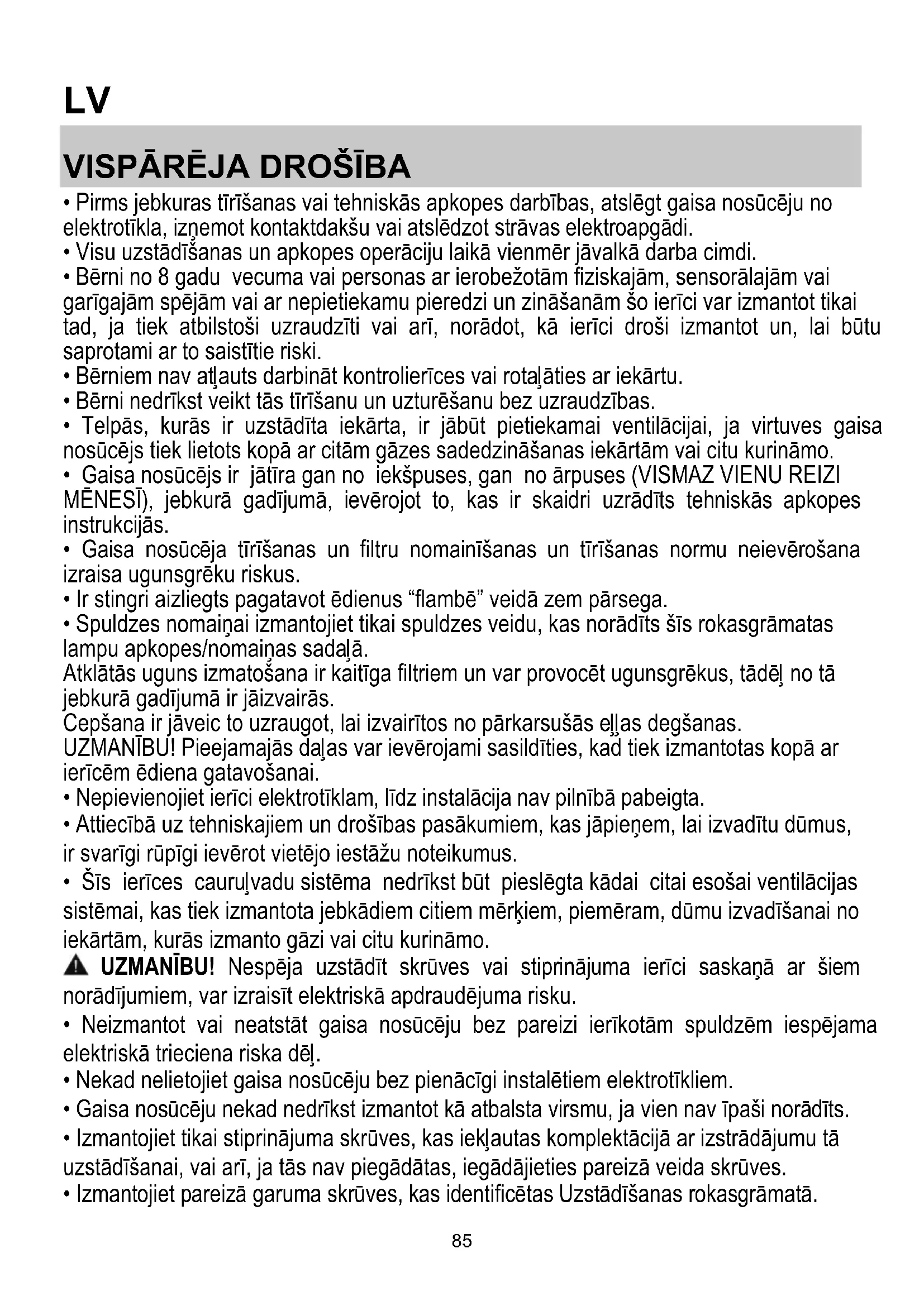 - Telpās, kurās ir uzstādīta iekārta, ir jābūt pietiekamai ventilācijai, ja virtuves gaisa nosūcējs tiek lietots kopā ar citām gāzes sadedzināšanas iekārtām vai citu kurināmo.