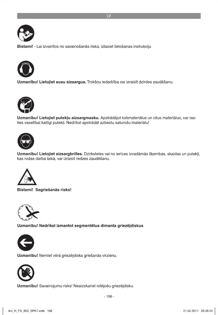 Bīstami! Sagriešanās risks! Uzmanību! Nedrīkst izmantot segmentētus dimanta griezējdiskus Bīstami! - Lai izvairītos no savainošanās riska, izlasiet lietošanas instrukciju Uzmanību! Lietojiet ausu aizsargus. Trokšņu iedarbība var izraisīt dzirdes zaudēšanu. Uzmanību! Lietojiet aizsargbrilles. Dzirksteles vai no ierīces izvadāmās šķembas, skaidas un putekļi, kas rodas darba laikā, var izraisīt redzes zaudēšanu. Uzmanību! Lietojiet putekļu aizsargmasku. Apstrādājot kokmateriālus un citus materiālus, var ras- ties veselībai kaitīgi putekļi. Nedrīkst apstrādāt azbestu saturošu materiālu! Uzmanību! Savainojumu risks! Neaizskariet rotējošu griezējdisku. Uzmanību! Ņemiet vērā griezējdiska griešanās virzienu. Anl_H_FS_800_SPK7.indb 198Anl_H_FS_800_SPK7.indb 198 01.02.2017 08:38:2401.02.2017 08:38:24LV
