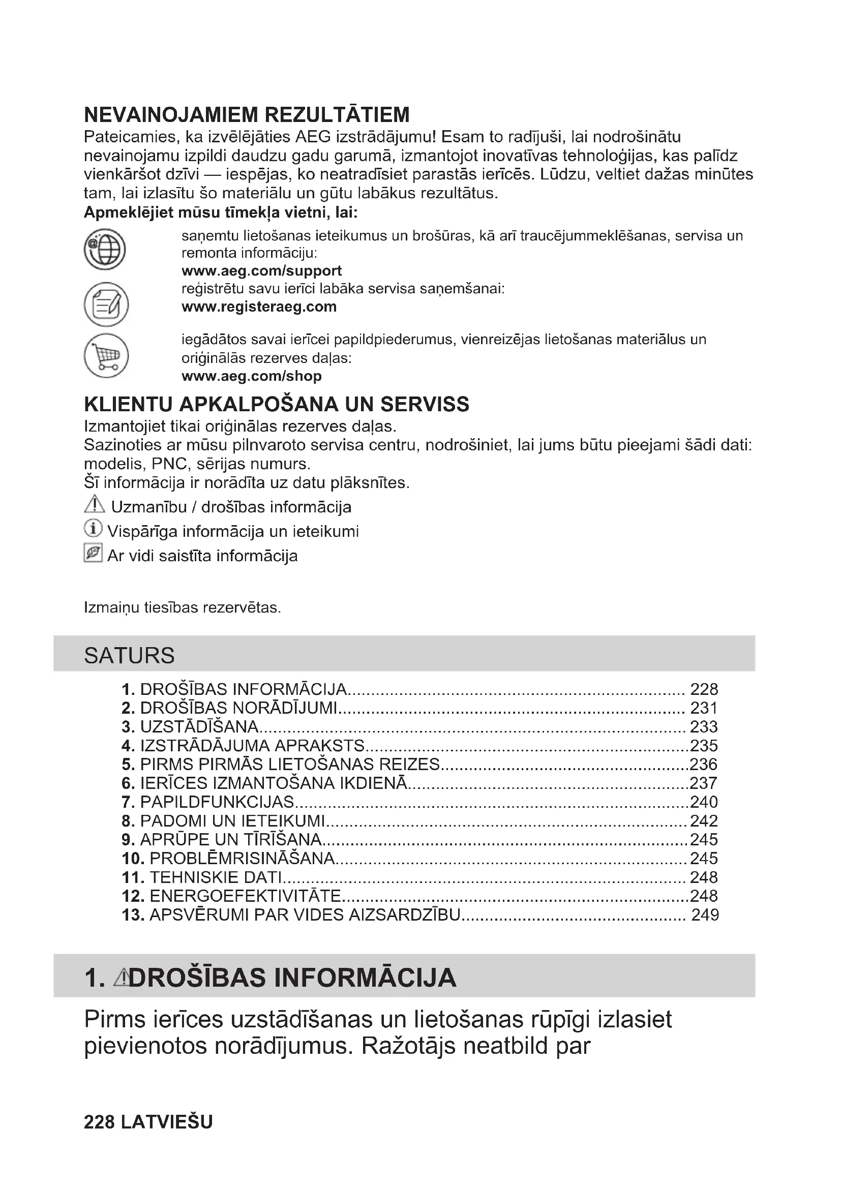 Pateicamies, ka izvēlējāties AEG izstrādājumu! Esam to radījuši, lai nodrošinātunevainojamu izpildi daudzu gadu garumā, izmantojot inovatīvas tehnoloģijas, kas palīdzvienkāršot dzīvi — iespējas, ko neatradīsiet parastās ierīcēs. Lūdzu, veltiet dažas minūtestam, lai izlasītu šo materiālu un gūtu labākus rezultātus.Apmeklējiet mūsu tīmekļa vietni, lai:saņemtu lietošanas ieteikumus un brošūras, kā arī traucējummeklēšanas, servisa unremonta informāciju:www.aeg.com/supportreģistrētu savu ierīci labāka servisa saņemšanai:www.registeraeg.comiegādātos savai ierīcei papildpiederumus, vienreizējas lietošanas materiālus unoriģinālās rezerves daļas:www.aeg.com/shop
