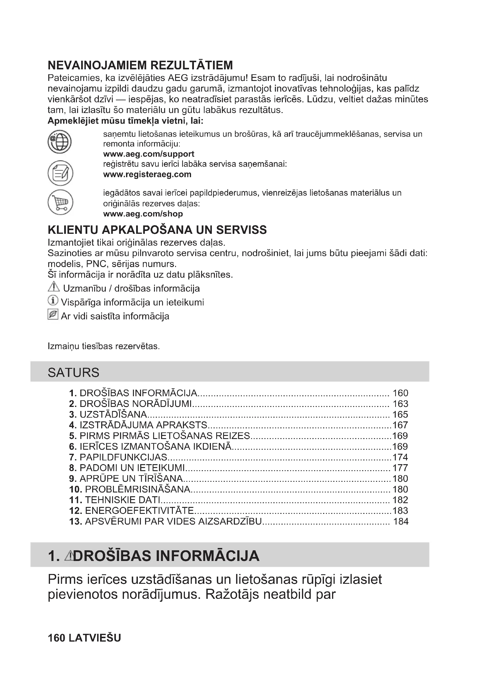 Pateicamies, ka izvēlējāties AEG izstrādājumu! Esam to radījuši, lai nodrošinātunevainojamu izpildi daudzu gadu garumā, izmantojot inovatīvas tehnoloģijas, kas palīdzvienkāršot dzīvi — iespējas, ko neatradīsiet parastās ierīcēs. Lūdzu, veltiet dažas minūtestam, lai izlasītu šo materiālu un gūtu labākus rezultātus.Apmeklējiet mūsu tīmekļa vietni, lai:saņemtu lietošanas ieteikumus un brošūras, kā arī traucējummeklēšanas, servisa unremonta informāciju:www.aeg.com/supportreģistrētu savu ierīci labāka servisa saņemšanai:www.registeraeg.comiegādātos savai ierīcei papildpiederumus, vienreizējas lietošanas materiālus unoriģinālās rezerves daļas:www.aeg.com/shop