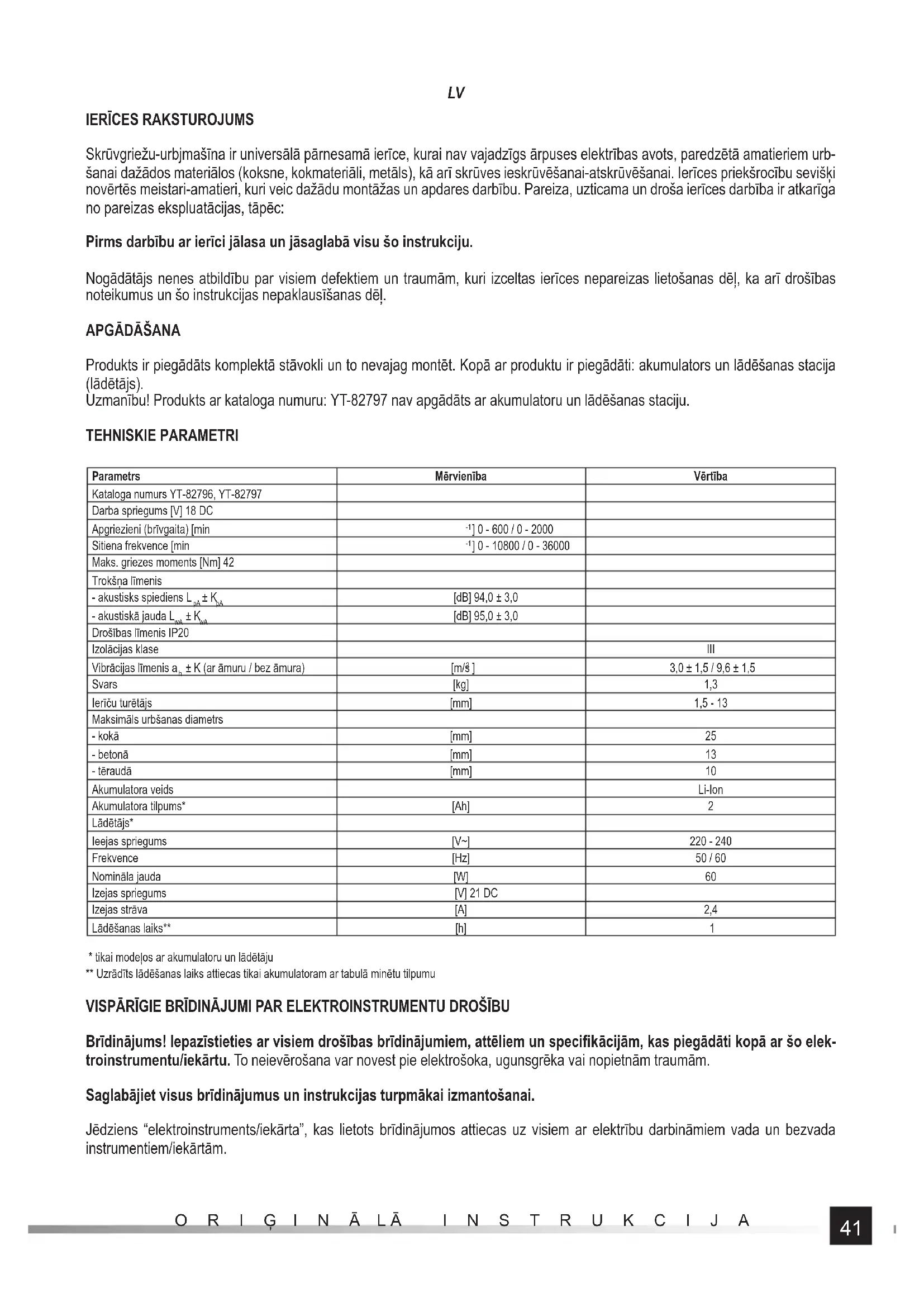 Produkts ir piegādāts komplektā stāvokli un to nevajag montēt. Kopā ar produktu ir piegādāti: akumulators un lādēšanas stacija (lādētājs). Uzmanību! Produkts ar kataloga numuru: YT-82797 nav apgādāts ar akumulatoru un lādēšanas staciju. TEHNISKIE PARAMETRI Parametrs Mērvienība Vērtība Kataloga numurs YT-82796, YT-82797 Darba spriegums [V] 18 DC Apgriezieni (brīvgaita) [min
