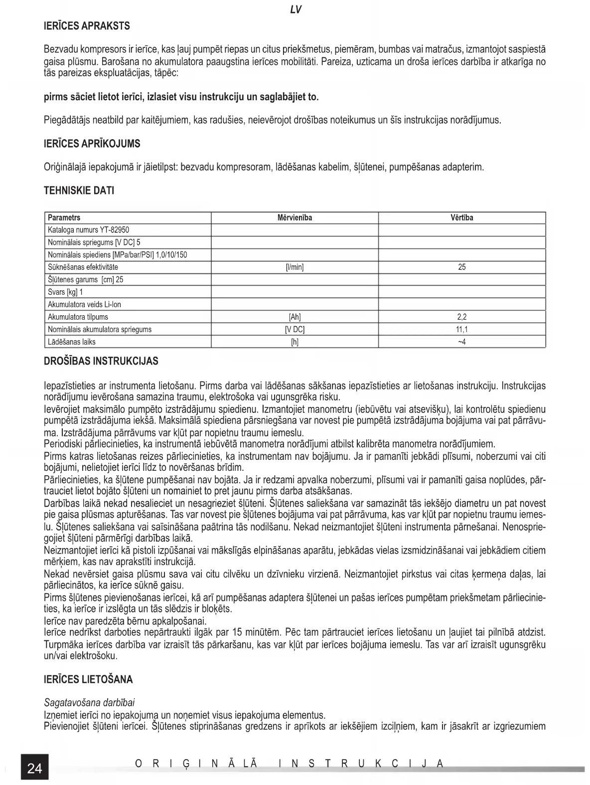 Oriģinālajā iepakojumā ir jāietilpst: bezvadu kompresoram, lādēšanas kabelim, šļūtenei, pumpēšanas adapterim. TEHNISKIE DATI Parametrs Mērvienība Vērtība Kataloga numurs YT-82950 Nominālais spriegums [V DC] 5 Nominālais spiediens [MPa/bar/PSI] 1,0/10/150 Sūknēšanas efektivitāte [l/min] 25 Šļūtenes garums [cm] 25 Svars [kg] 1 Akumulatora veids Li-Ion Akumulatora tilpums [Ah] 2,2 Nominālais akumulatora spriegums [V DC] 11,1 Lādēšanas laiks [h] ~4