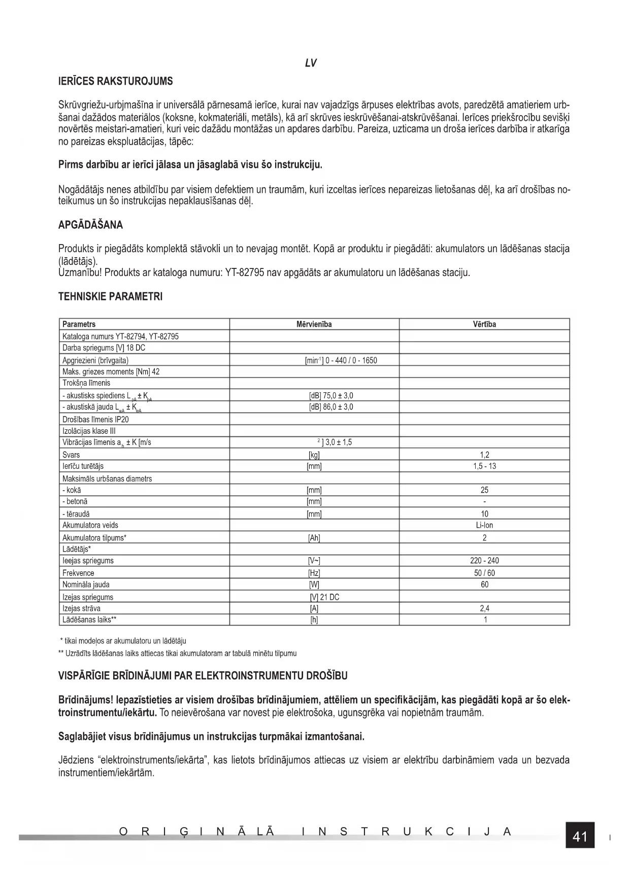 - tikai modeļos ar akumulatoru un lādētāju ** Uzrādīts lādēšanas laiks attiecas tikai akumulatoram ar tabulā minētu tilpumu VISPĀRĪGIE BRĪDINĀJUMI PAR ELEKTROINSTRUMENTU DROŠĪBU Brīdinājums! Iepazīstieties ar visiem drošības brīdinājumiem, attēliem un specifi kācijām, kas piegādāti kopā ar šo elek- troinstrumentu/iekārtu. To neievērošana var novest pie elektrošoka, ugunsgrēka vai nopietnām traumām. Saglabājiet visus brīdinājumus un instrukcijas turpmākai izmantošanai. Jēdziens “elektroinstruments/iekārta”, kas lietots brīdinājumos attiecas uz visiem ar elektrību darbināmiem vada un bezvada instrumentiem/iekārtām.42