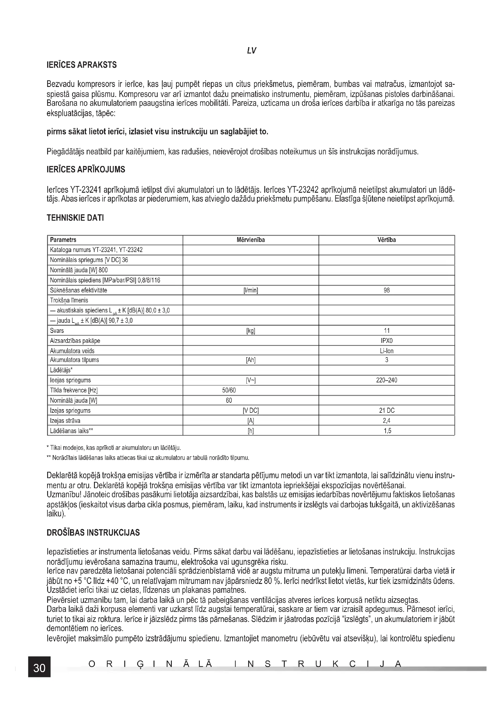 tājs. Abas ierīces ir aprīkotas ar piederumiem, kas atvieglo dažādu priekšmetu pumpēšanu. Elastīga šļūtene neietilpst aprīkojumā. TEHNISKIE DATI Parametrs Mērvienība Vērtība Kataloga numurs YT-23241, YT-23242 Nominālais spriegums [V DC] 36 Nominālā jauda [W] 800 Nominālais spiediens [MPa/bar/PSI] 0,8/8/116 Sūknēšanas efektivitāte [l/min] 98 Trokšņa līmenis — akustiskais spiediens L