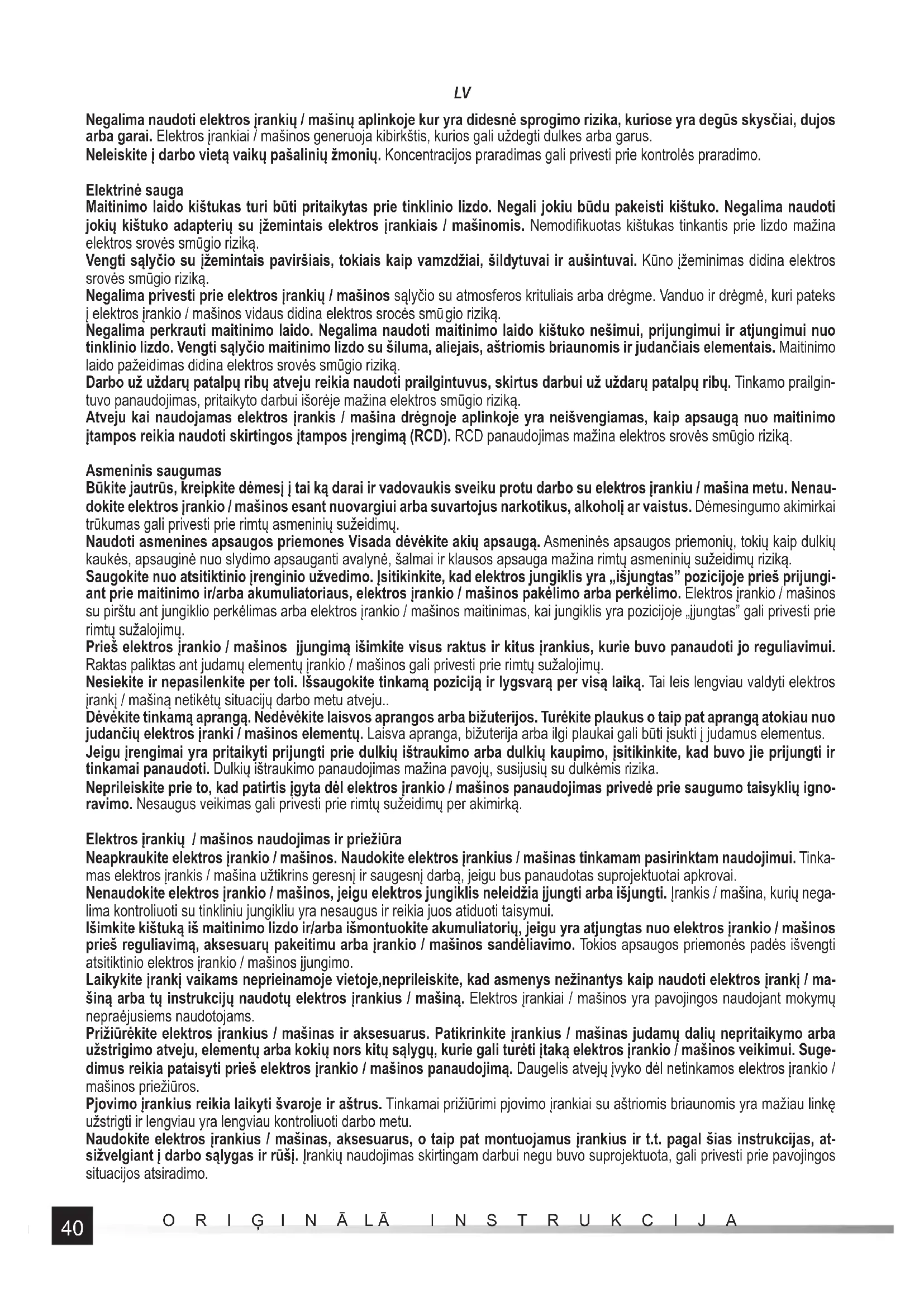 - Tikai modeļos, kas aprīkoti ar akumulatoru un lādētāju. ** Norādītais lādēšanas laiks attiecas tikai uz akumulatoru ar tabulā norādīto tilpumu. Deklarētā trokšņa emisijas vērtība ir izmērīta ar standarta pētījumu metodi un var tikt izmantota, lai salīdzinātu vienu instrumentu ar otru. Deklarētā kopējā trokšņa emisijas vērtība var tikt izmantota iedarbības sākotnējai novērtēšanai. Uzmanību! Jānoteic drošības pasākumi lietotāja aizsardzībai, kas balstās uz emisiju iedarbības novērtējumu faktiskos lietošanas apstākļos (ieskaitot visas darba cikla daļas, piemēram, laiku, kad instruments ir izslēgts vai darbojas tukšgaitā, un aktivizēšanas laiku). BENDRI ĮSPĖJIMAI DĖL ELEKTROS ĮRANKIŲ SAUGUMO Įspėjimas! Reikia susipažinti su visais saugumo įspėjimais, iliustracijomis, o taip pat specifi kacijomis, pristatytomis su elektros įrankiais / mašina. Jų nesilaikymas gali privesti prie elektros srovės smūgio, gaisro arba kūno sužalojimo. Saugoti visus įspėjimus, o taip pat instrukcijas sekančiam kartui. Sąvoka „elektros įrankis / mašina” panaudota įspėjimuose susijusiuose su visais įrankiais / mašinų maitinamų elektros srove, su laidais kaip ir be laidų.. Saugumas darbo vietoje Darbo vieta turi būti gerai apšviesta ir švari. Netvarka ir silpnas apšvietimas gali būti nelaimingų atsitikimų priežastimi.40