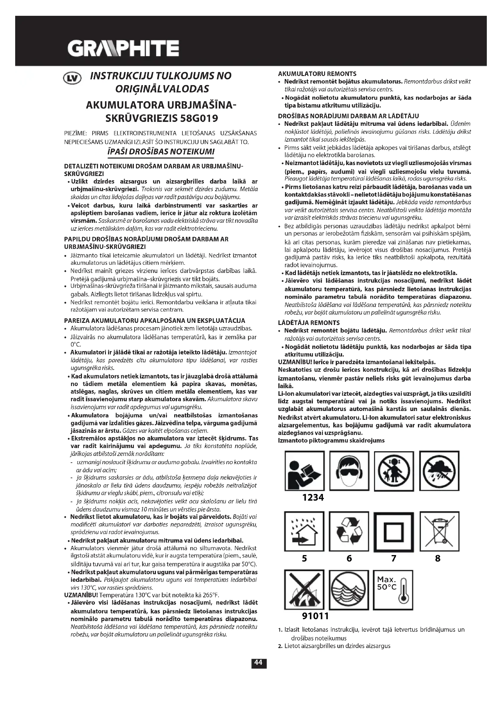 - Nedrīkst remontēt bojātu lādētāju. Remontdarbus drīkst veikt tikai ražotājs vai autorizētais servisa centrs. • Nogādāt nolietotu lādētāju punktā, kas nodarbojas ar šāda tipa atkritumu utilizāciju.UZMANĪBU! Ierīce ir paredzēta izmantošanai iekštelpās.Neskatoties uz drošu ierīces konstrukciju, kā arī drošības līdzekļu izmantošanu, vienmēr pastāv neliels risks gūt ievainojumus darba laikā.Li-Ion akumulatori var iztecēt, aizdegties vai uzsprāgt, ja tiks uzsildīti līdz augstai temperatūrai vai ja notiks īssavienojums. Nedrīkst uzglabāt akumulatorus automašīnā karstās un saulainās dienās. Nedrīkst atvērt akumulatoru. Li-Ion akumulatori satur elektroniskus aizsargelementus, kas bojājumu gadījumā var radīt akumulatora aizdegšanos vai uzsprāgšanu.Izmantoto piktogrammu skaidrojums