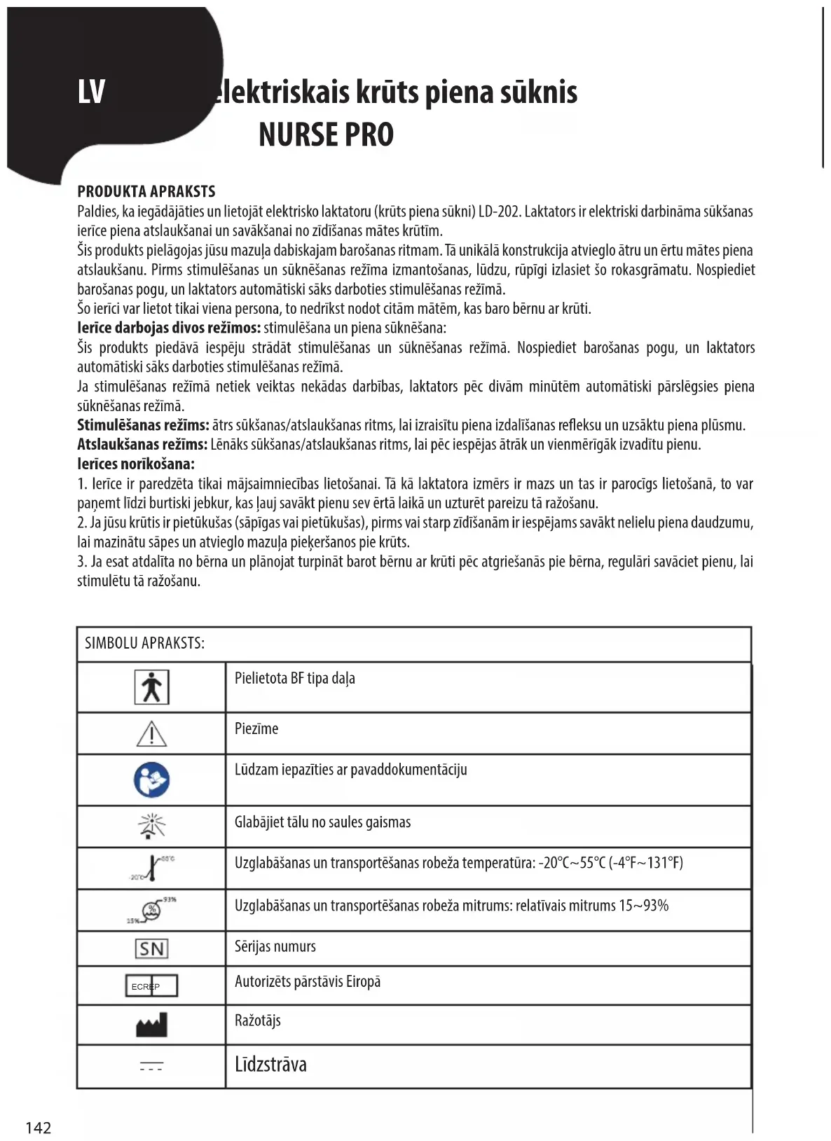 Siųstuvų, kurių maksimali išvesties galia nėra nurodyta aukščiau, rekomenduojamas atstumas d metrais (m) gali būti apska- ičiuojamas pagal lygtį, taikomą siųstuvo dažniui, kur P yra siųstuvo maksimali išvesties galia vatais (W), nurodyta siųstuvo gamintojo. 1 PASTABA. Esant dažnių diapazonui nuo 80 MHz iki 800 MHz, taikomas atskyrimo atstumas. 2 PASTABA. Šios rekomendacijos gali būti taikomos ne visose situacijose. Elektromagnetinių bangų sklidimui įtaką daro absorbcija ir atspin- dėjimas nuo konstrukcijų, objektų ar žmonių. 4 lentelė142 LV Divfāzu elektriskais krūts piena sūknis NURSE PRO PRODUKTA APRAKSTS Paldies, ka iegādājāties un lietojāt elektrisko laktatoru (krūts piena sūkni) LD-202. Laktators ir elektriski darbināma sūkšanas ierīce piena atslaukšanai un savākšanai no zīdīšanas mātes krūtīm. Šis produkts pielāgojas jūsu mazuļa dabiskajam barošanas ritmam. Tā unikālā konstrukcija atvieglo ātru un ērtu mātes piena atslaukšanu. Pirms stimulēšanas un sūknēšanas režīma izmantošanas, lūdzu, rūpīgi izlasiet šo rokasgrāmatu. Nospiediet barošanas pogu, un laktators automātiski sāks darboties stimulēšanas režīmā. Šo ierīci var lietot tikai viena persona, to nedrīkst nodot citām mātēm, kas baro bērnu ar krūti. Ierīce darbojas divos režīmos: stimulēšana un piena sūknēšana: Šis produkts piedāvā iespēju strādāt stimulēšanas un sūknēšanas režīmā. Nospiediet barošanas pogu, un laktators automātiski sāks darboties stimulēšanas režīmā. Ja stimulēšanas režīmā netiek veiktas nekādas darbības, laktators pēc divām minūtēm automātiski pārslēgsies piena sūknēšanas režīmā. Stimulēšanas režīms: ātrs sūkšanas/atslaukšanas ritms, lai izraisītu piena izdalīšanas reeksu un uzsāktu piena plūsmu. Atslaukšanas režīms: Lēnāks sūkšanas/atslaukšanas ritms, lai pēc iespējas ātrāk un vienmērīgāk izvadītu pienu. Ierīces norīkošana: 1. Ierīce ir paredzēta tikai mājsaimniecības lietošanai. Tā kā laktatora izmērs ir mazs un tas ir parocīgs lietošanā, to var paņemt līdzi burtiski jebkur, kas ļauj savākt pienu sev ērtā laikā un uzturēt pareizu tā ražošanu. 2. Ja jūsu krūtis ir pietūkušas (sāpīgas vai pietūkušas), pirms vai starp zīdīšanām ir iespējams savākt nelielu piena daudzumu, lai mazinātu sāpes un atvieglo mazuļa pieķeršanos pie krūts. 3. Ja esat atdalīta no bērna un plānojat turpināt barot bērnu ar krūti pēc atgriešanās pie bērna, regulāri savāciet pienu, lai stimulētu tā ražošanu. SIMBOLU APRAKSTS: Pielietota BF tipa daļa Piezīme Lūdzam iepazīties ar pavaddokumentāciju Glabājiet tālu no saules gaismas Uzglabāšanas un transportēšanas robeža temperatūra: -20°C~55°C (-4°F~131°F) Uzglabāšanas un transportēšanas robeža mitrums: relatīvais mitrums 15~93% Sērijas numurs EC REP Autorizēts pārstāvis Eiropā Ražotājs Līdzstrāva143