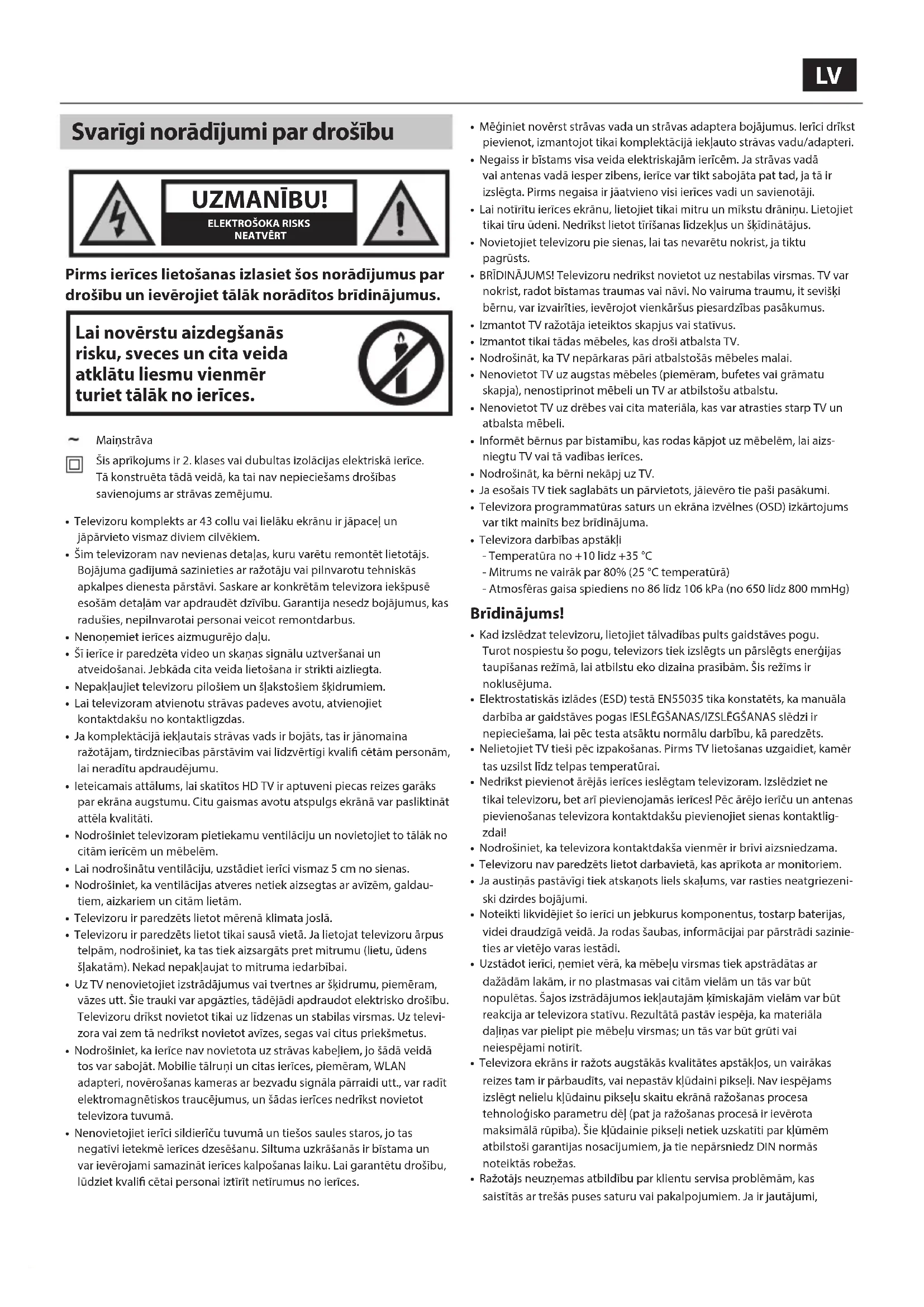 Pirms ierīces lietošanas izlasiet šos norādījumus par drošību un ievērojiet tālāk norādītos brīdinājumus. Lai novērstu aizdegšanās risku, sveces un cita veida atklātu liesmu vienmēr turiet tālāk no ierīces. Maiņstrāva Šis aprīkojums ir 2.klases vai dubultas izolācijas elektriskā ierīce. Tā konstruēta tādā veidā, ka tai nav nepieciešams drošības savienojums ar strāvas zemējumu.