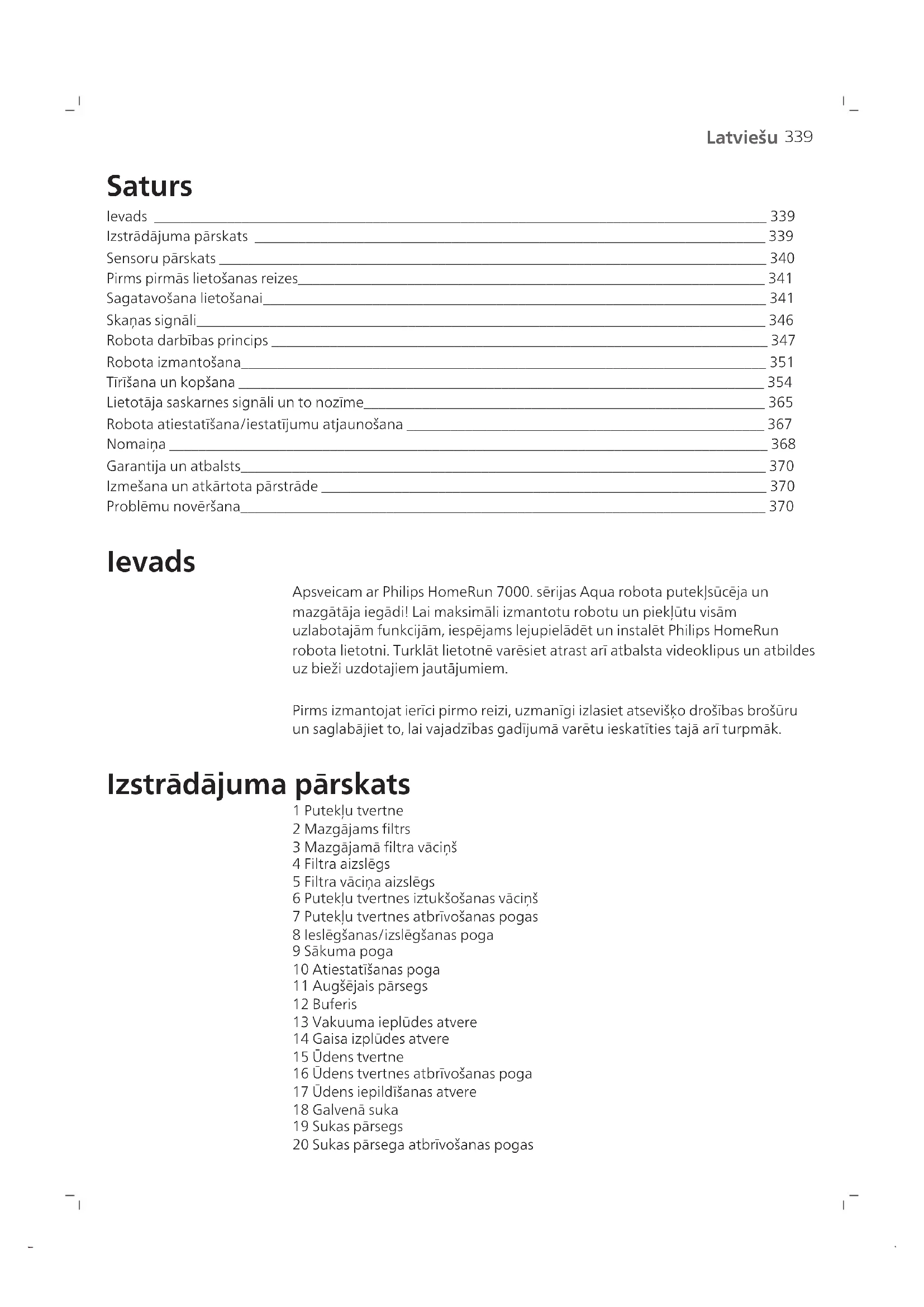Latviešu Saturs Ievads ____________________________________________________________________________________ 339 Izstrādājuma pārskats ______________________________________________________________________ 339 Sensoru pārskats ___________________________________________________________________________ 340 Pirms pirmās lietošanas reizes________________________________________________________________ 341 Sagatavošana lietošanai_____________________________________________________________________ 341 Skaņas signāli______________________________________________________________________________ 346 Robota darbības princips ____________________________________________________________________ 347 Robota izmantošana________________________________________________________________________ 351 Tīrīšana un kopšana ________________________________________________________________________ 354 Lietotāja saskarnes signāli un to nozīme_______________________________________________________ 365 Robota atiestatīšana/iestatījumu atjaunošana _________________________________________________ 367 Nomaiņa __________________________________________________________________________________ 368 Garantija un atbalsts________________________________________________________________________ 370 Izmešana un atkārtota pārstrāde _____________________________________________________________ 370 Problēmu novēršana________________________________________________________________________ 370 Ievads Apsveicam ar Philips HomeRun 7000.sērijas Aqua robota putekļsūcēja un mazgātāja iegādi! Lai maksimāli izmantotu robotu un piekļūtu visām uzlabotajām funkcijām, iespējams lejupielādēt un instalēt Philips HomeRun robota lietotni. Turklāt lietotnē varēsiet atrast arī atbalsta videoklipus un atbildes uz bieži uzdotajiem jautājumiem. Pirms izmantojat ierīci pirmo reizi, uzmanīgi izlasiet atsevišķo drošības brošūru un saglabājiet to, lai vajadzības gadījumā varētu ieskatīties tajā arī turpmāk. Izstrādājuma pārskats 1 Putekļu tvertne 2 Mazgājamsfiltrs 3 Mazgājamā filtra vāciņš 4 Filtra aizslēgs 5 Filtra vāciņa aizslēgs 6 Putekļu tvertnes iztukšošanas vāciņš 7 Putekļu tvertnes atbrīvošanas pogas 8 Ieslēgšanas/izslēgšanas poga 9 Sākuma poga 10 Atiestatīšanas poga 11 Augšējais pārsegs 12 Buferis 13 Vakuuma ieplūdes atvere 14 Gaisa izplūdes atvere 15 Ūdens tvertne 16 Ūdens tvertnes atbrīvošanas poga 17 Ūdens iepildīšanas atvere 18 Galvenā suka 19 Sukas pārsegs 20 Sukas pārsega atbrīvošanas pogas340 Latviešu 21 Galvenie ritentiņi 22 Priekšējais ritentiņš 23 Uzlādes kontaktpunkti (robots) 24 Sānu suka 25 Mazgāšanas sukas paliktņa turētājs 26 Mazgājams sukas paliktnis (2x) 27 Barošanas vads (XU7000) 28 (Uzlādes) stacija (XU7000) 29 IS signāllodziņš (XU7000) 30 Uzlādes kontaktpunkti (stacija) 31 Barošanas vada ligzda 32 Paklājiņš (XU7000) 33 Putekļu maisiņš (2x) (XU7100) 34 Tvertnes vāciņš 35 Putekļu maisiņa nodalījums 36 Automātiskās iztukšošanas stacija (XU7100) 37 Indikatora lampiņa 38 IS signāllodziņš 39 Rampa 40 Automātiskās iztukšošanas gaisa ieplūdes atvere 41 Automātiskās iztukšošanas gaisa izplūdes atvere 42 Uzlādes kontaktpunkti (stacija) 43 Izplūdes atvere 44 Sukas tīrīšanas rīks 45 Barošanas vada ligzda 46 Barošanas vads (XU7100) Sensoru pārskats