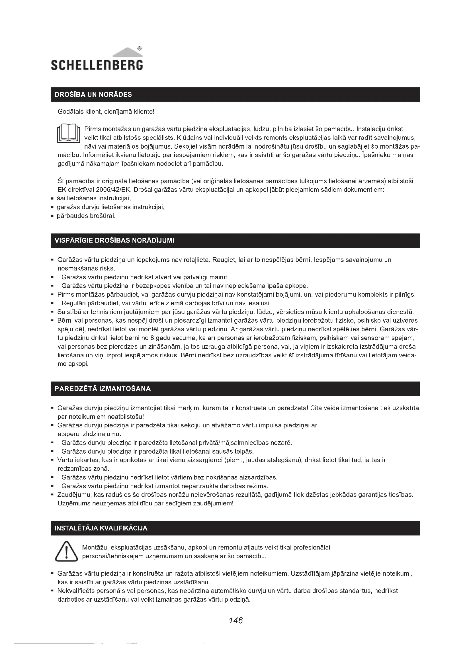 Garāžas vārtu piedziņu nedrīkst lietot smagu vārtu pacelšanai. Pārbaudiet, vai vārtus var viegli atvērt un aizvērt ar rokām. Pārbaudiet, vai starpliku gredzeni ir ievietoti pareizi, paceļot vārtus par vienu metru un tad tos atlaižot. Šajā pozīcijā vārti nedrīkst pārvietoties augšup vai lejup. Garāžas vārtu izlīdzināšanas atsperes pāriestatīšanu drīkst veikt tikai pilnvarots serviss. Garāžas jumtam jābūt piemērotam garāžas vārtu piedziņas montāžai. Pārbaudiet, vai ir nepieciešams piemontēt papildu stiprinājumu daļas. DROŠĪBAS NORĀDĪJUMI PAR MONTĀŽU Montāžas darbu laikā ievērojiet visus spēkā esošos darba drošības noteikumus, kā arī visus spēkā esošos noteikumus par elektrisko iekārtu ekspluatāciju. Šim mērķim obligāti jāievēro attiecīgās valsts direktīvas. Sekojiet šīs montāžas pamācības norādēm. Ja uzstādīšanas laikā neesat pārliecināts, lūdzu, sazinieties ar mūsu klientu servisu (skat. aizmuguri). Veicot montāžu atbilstoši šai pamācībai tiek novērsts apdraudējums DIN EN 13241-1 izpratnē. Strāvas pieslēgumus drīkst veikt tikai serticēts elektriķis. Garāžas vārtiem jābūt balansētiem. Nekustīgiem vai smagnēji pārvietojamiem vārtiem ir jāveic remonts. Nenobalansēti vārti, vārtu atsperes, kabeļi, paplāksnes, stiprinājumi un sliedes ir pakļauti papildu slodzei, un var izraisīt smagus savainojumus. Nemēģiniet vārtus atbrīvot, bīdīt vai noregulēt. Meklējiet atbilstošu speciālistu. Garāžām bez papildu piekļuves iespējas ir nepieciešama pagriežamā roktura avārijas atbloķēšana (preces. Nr.: 60553) vai avārijas atbloķēšanas slēdzene (preces. Nr.: 60511). Šīs ierīces bojājuma vai strāvas padeves pārtraukuma gadījumā palīdz novērst iespējamu ieslēgšanos garāžā vai garāžas aizslēgšanu bez atslēgām. Pirms garāžas vārtu piedziņas montāžas noņemiet esošos bloķēšanas elementus un slēdzenes, lai tās neietekmētu garāžas vārtu piedziņu lietošanu. Uzstādiet visus papildu vadības elementus (piem., atslēgslēdzi (preces Nr.: 25101, 25102) vai sienas slēdzi (preces Nr.: 60060)) vismaz 1,5 m augstumā un garāžas vārtu redzamības zonā, taču tālu no kustīgām detaļām un ārpus bērnu aizsniedzamības zonas. Brīdinājuma norādes par ieķeršanos piestipriniet labi redzamā vietā vai slēdža tuvumā. Manuālās atbloķēšanas uzlīmi piestipriniet garāžas vārtu piedziņas tuvumā. Pirms jūsu garāžas vārtu piedziņas ekspluatācijas uzsākšanas pārliecinieties, ka vārtu pārvietošanās ceļā nav šķēršļu. Rūpīgi izlasiet lietošanas pamācību. Montāžas laikā ievērojiet attēlos norādītos minimālos attālumus. Urbšanas putekļi netīrumi vai skaidas nedrīkst iekļūt garāžas vārtu piedziņas galvā vai sliežu sistēmā. Montāžas darbu laikā šīs detaļas rūpīgi pārklājiet. DROŠĪBAS NORĀDĪJUMI PAR EKSPLUATĀCIJAS UZSĀKŠANU Pārbaudiet strāvas pieslēgumu. Tā vērtībām jāatbilst šajā lietošanas pamācībā norādītajām vērtībām. Parametri attiecas uz garāžas vārtu piedziņas datu plāksnīti. Garāžas strāvas pieslēgumam jāatbilst vietējiem noteikumiem. Garāžas vārtu piedziņas drošības funkcijas pārbaudiet šādi: Novietojiet zem garāžas vārtu galvenās aizvēršanās malas apm. 50 mm augstu priekšmetu (piem., koka gabalu). Ļaujiet vārtiem nolaisties. Vārtiem atduroties pret šķērsli, garāžas vārtu piedziņai jāpārslēdzas pretējā darbības režīmā un jāatbrīvo šķērslis. Jūsu papildu drošībai izmantojiet papildaprīkojuma fotoelementu (preces Nr.: 60030) un regulāri pārbaudiet automātisko atpakaļgaitu. Pēc mācību kustības jāveic drošības ierīces pārbaude (šķēršļu atpazīšana ar jaudas atslēgšanu un fotoelementu). Gala preces vai tās kombinācijas ekspluatācijas uzsākšana no „Alfred Schellenberg GmbH” nav atļauta līdz brīdim, kad gala produkta vai garāžas vārtu piedziņas un garāžas vārtu piedziņas kombinācija atbilst šeit spēkā esošajiem noteiku miem, specikācijām vai direktīvām. Šaubu gadījumā ieteicams lūgt profesionāla montāžas uzņēmuma palīdzību (skatiet pievienoto atbilstības apliecinājumu).148 149 EKSPLUATĀCIJAS DROŠĪBAS NORĀDĪJUMI Drošības aiztures sistēma, kas darbojas nepareizi, var izraisīt materiālos zaudējumus, smagus savainojumus vai nāvi. Pirms izbraukt vai iziet no garāžas, pārliecinieties, ka garāžas vārti ir pilnībā atvērti un atrodas miera pozīcijā. Pēc iziešanas vai izbraukšanas pārliecinieties, ka garāžas vārti ir pilnībā aizvērti. Lietojot avārijas atbloķēšanu, raugiet, lai vājas vai salūzušas atsperes neizraisītu pēkšņu atvērto garāžas vārtu nolaišanos lejup Ar garāžas vārtu piedziņu un raidītāju nedrīkst spēlēties bērni. Raidītājus glabājiet bērniem nepieejamā vietā. Kontrolējiet kustīgos vārtus. Personas garāžas vārtu bīstamajā zonā nedrīkst atrasties līdz brīdim, kad vārti ir pilnībā atvērti vai aizvērti. Ja garāžas vārtu piedziņai ir tikai viena drošības ierīce, tad piedziņu aktivizējiet tikai brīdī, kad esat redzamības zonā. Nekad nestāviet zem atvērtiem vārtiem. Vārtu pārvietošanās laikā netveriet aiz vadotnes sliedes. Garāžas vārtu piedziņas pieslēguma spailēm nepievienojiet tīkla spriegumu (230 V/50 Hz). Ja raidītājs tiek uzglabāts bikšu kabatā vai rokassomiņā, tad ir iespējama kļūdaina raidītāja nostrāde un neparedzēta vārtu kustība. APKOPES, REMONTA UN TĪRĪŠANAS DROŠĪBAS NORĀDES Tīrīšanas, apkopes un nomaiņas laikā garāžas vārtu piedziņai jābūt atvienotai no tīkla. Veiciet regulāru iekārtas pārbaudi. Jo īpaši pārbaudiet, vai kabeļiem, atsperēm un stiprinājumiem nav konstatējamas nodilu- ma, bojājumu vai līdzsvara zuduma pazīmes. Neizmantojiet garāžas vārtu piedz