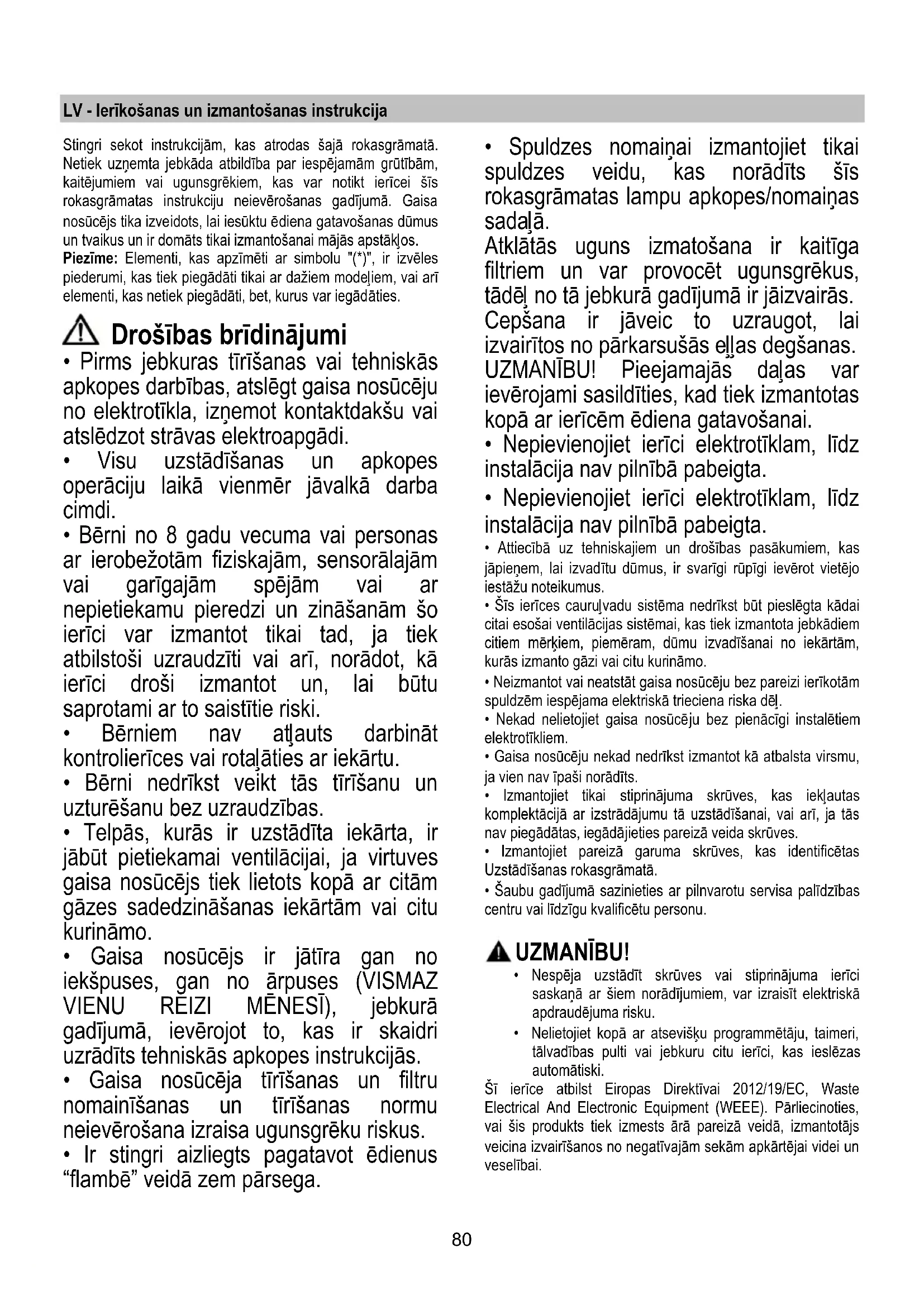 - Spuldzes nomaiņai izmantojiet tikai spuldzes veidu, kas norādīts šīs rokasgrāmatas lampu apkopes/nomaiņas sadaļā. Atklātās uguns izmatošana ir kaitīga filtriem un var provocēt ugunsgrēkus, tādēļ no tā jebkurā gadījumā ir jāizvairās. Cepšana ir jāveic to uzraugot, lai izvairītos no pārkarsušās eļļas degšanas. UZMANĪBU! Pieejamajās daļas var ievērojami sasildīties, kad tiek izmantotas kopā ar ierīcēm ēdiena gatavošanai.