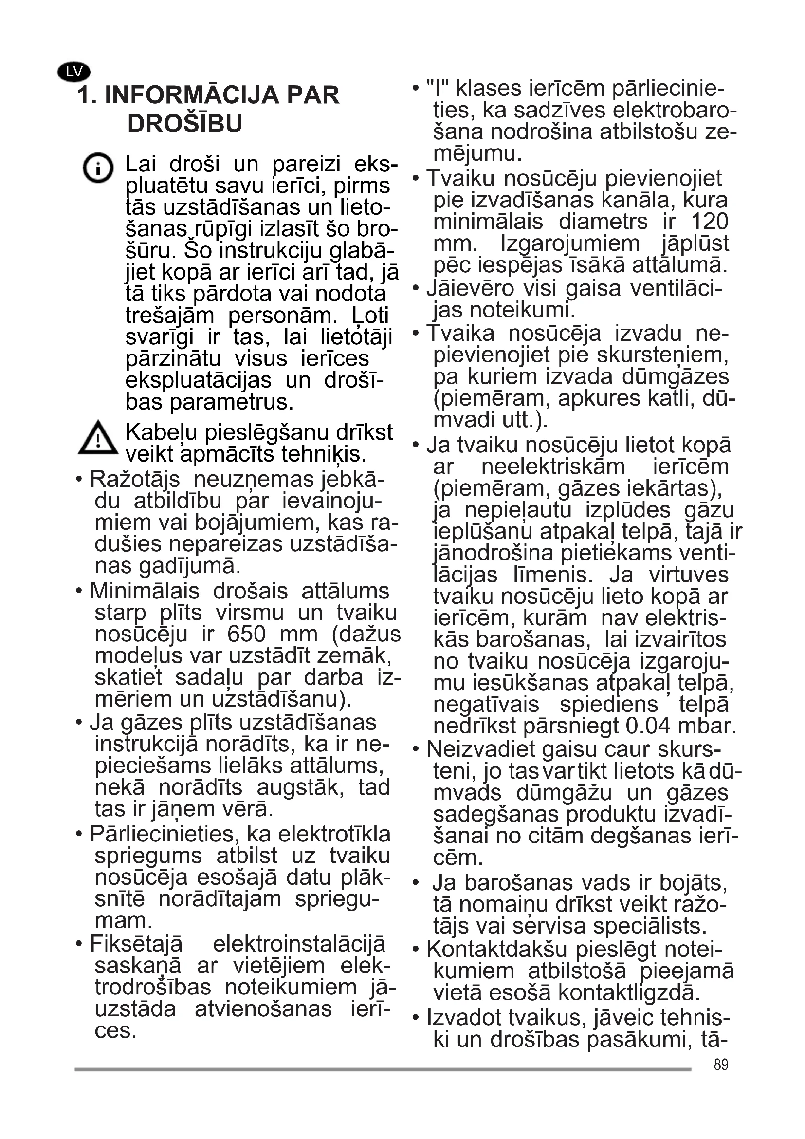DROŠĪBU Lai droši un pareizi eks- pluatētu savu ierīci, pirms tās uzstādīšanas un lieto- šanas rūpīgi izlasīt šo bro- šūru. Šo instrukciju glabā- jiet kopā ar ierīci arī tad, jā tā tiks pārdota vai nodota trešajām personām. Ļoti svarīgi ir tas, lai lietotāji pārzinātu visus ierīces ekspluatācijas un drošī- bas parametrus. Kabeļu pieslēgšanu drīkst veikt apmācīts tehniķis.