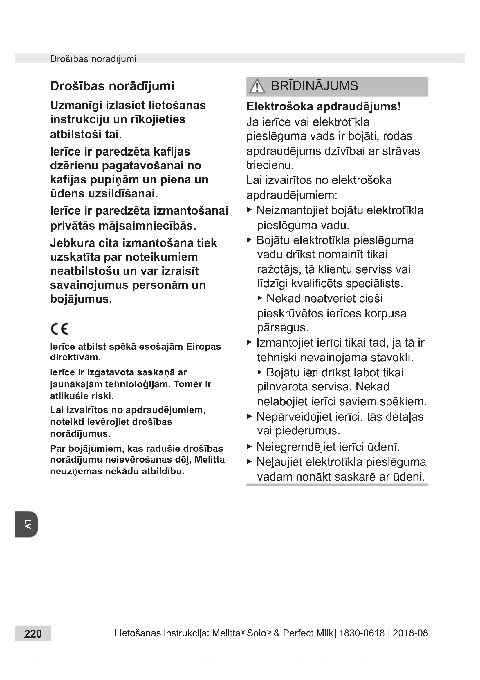 Drošības norādījumi Uzmanīgi izlasiet lietošanas instrukciju un rīkojieties atbilstoši tai. Ierīce ir paredzēta kafi jas dzērienu pagatavošanai no kafi jas pupiņām un piena un ūdens uzsildīšanai. Ierīce ir paredzēta izmantošanai privātās mājsaimniecībās. Jebkura cita izmantošana tiek uzskatīta par noteikumiem neatbilstošu un var izraisīt savainojumus personām un bojājumus. Ierīce atbilst spēkā esošajām Eiropas direktīvām. Ierīce ir izgatavota saskaņā ar jaunākajām tehnioloģijām. Tomēr ir atlikušie riski. Lai izvairītos no apdraudējumiem, noteikti ievērojiet drošības norādījumus. Par bojājumiem, kas radušie drošības norādījumu neievērošanas dēļ, Melitta neuzņemas nekādu atbildību.