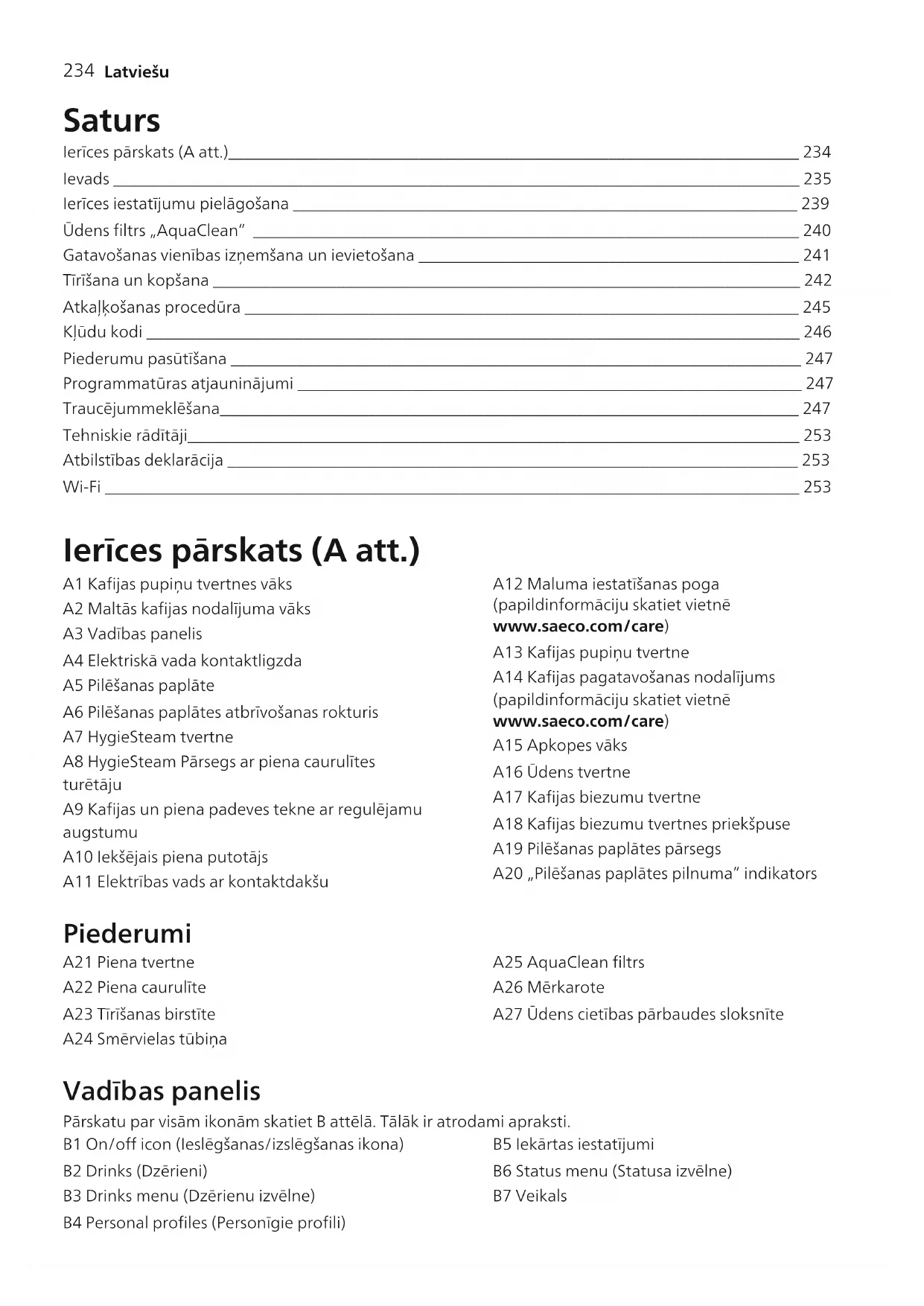 Latviešu Saturs Ierīces pārskats (Aatt.)_____________________________________________________________________ 234 Ievads ___________________________________________________________________________________ 235 Ierīces iestatījumu pielāgošana _____________________________________________________________ 239 Ūdens filtrs „AquaClean” __________________________________________________________________ 240 Gatavošanas vienības izņemšana un ievietošana ______________________________________________ 241 Tīrīšana un kopšana _______________________________________________________________________ 242 Atkaļķošanas procedūra ___________________________________________________________________ 245 Kļūdu kodi _______________________________________________________________________________ 246 Piederumu pasūtīšana _____________________________________________________________________ 247 Programmatūras atjauninājumi _____________________________________________________________ 247 Traucējummeklēšana______________________________________________________________________ 247 Tehniskie rādītāji__________________________________________________________________________ 253 Atbilstības deklarācija _____________________________________________________________________ 253 Wi-Fi ____________________________________________________________________________________ 253 Ierīces pārskats (Aatt.) A1 Kafijas pupiņu tvertnes vāks A2 Maltās kafijas nodalījuma vāks A3 Vadības panelis A4 Elektriskā vada kontaktligzda A5 Pilēšanas paplāte A6 Pilēšanas paplātes atbrīvošanas rokturis A7 HygieSteam tvertne A8 HygieSteam Pārsegs ar piena caurulītes turētāju A9 Kafijas un piena padeves tekne ar regulējamu augstumu A10 Iekšējais piena putotājs A11 Elektrības vads ar kontaktdakšu A12 Maluma iestatīšanas poga (papildinformāciju skatiet vietnē www.saeco.com/care) A13 Kafijas pupiņu tvertne A14 Kafijas pagatavošanas nodalījums (papildinformāciju skatiet vietnē www.saeco.com/care) A15 Apkopes vāks A16 Ūdens tvertne A17 Kafijas biezumu tvertne A18 Kafijas biezumu tvertnes priekšpuse A19 Pilēšanas paplātes pārsegs A20 „Pilēšanas paplātes pilnuma” indikators Piederumi A21 Piena tvertne A22 Piena caurulīte A23 Tīrīšanas birstīte A24 Smērvielas tūbiņa A25 AquaClean filtrs A26 Mērkarote A27 Ūdens cietības pārbaudes sloksnīte Vadības panelis Pārskatu par visām ikonām skatiet B attēlā. Tālāk ir atrodami apraksti. B1 On/off icon (Ieslēgšanas/izslēgšanas ikona) B2 Drinks (Dzērieni) B3 Drinks menu (Dzērienu izvēlne) B4 Personal profiles (Personīgie profili) B5 Iekārtas iestatījumi B6 Status menu (Statusa izvēlne) B7 Veikals235 Latviešu B8 Start/stop icon (Sākšanas/apturēšanas ikona) Ievads Apsveicam ar pilnīgi automātiskā „Saeco” kafijas automāta iegādi! Lai pilnībā izmantotu Saeco piedāvāto tiešsaistes atbalstu, varat izmantot vadības paneli, lai reģistrētu kafijas automātu, izmantojot iebūvēto Wi-Fi savienojumu, vai doties uz vietni www.saeco.com/MyCoffeeMachine un šeit reģistrēt savu izstrādājumu. Pirms izmantojat ierīci pirmo reizi, uzmanīgi izlasiet atsevišķo drošības brošūru un saglabājiet to, lai vajadzības gadījumā varētu ieskatīties tajā arī turpmāk. Jūsu pilnībā automātiskais kafijas automāts Saeco ļauj izveidot savienojumu ar Wi-Fi tīklu, lai uzlabotu kafijas baudīšanas pieredzi. Izveidojot kafijas automāta savienojumu ar Wi-Fi tīklu, jūs varēsiet: