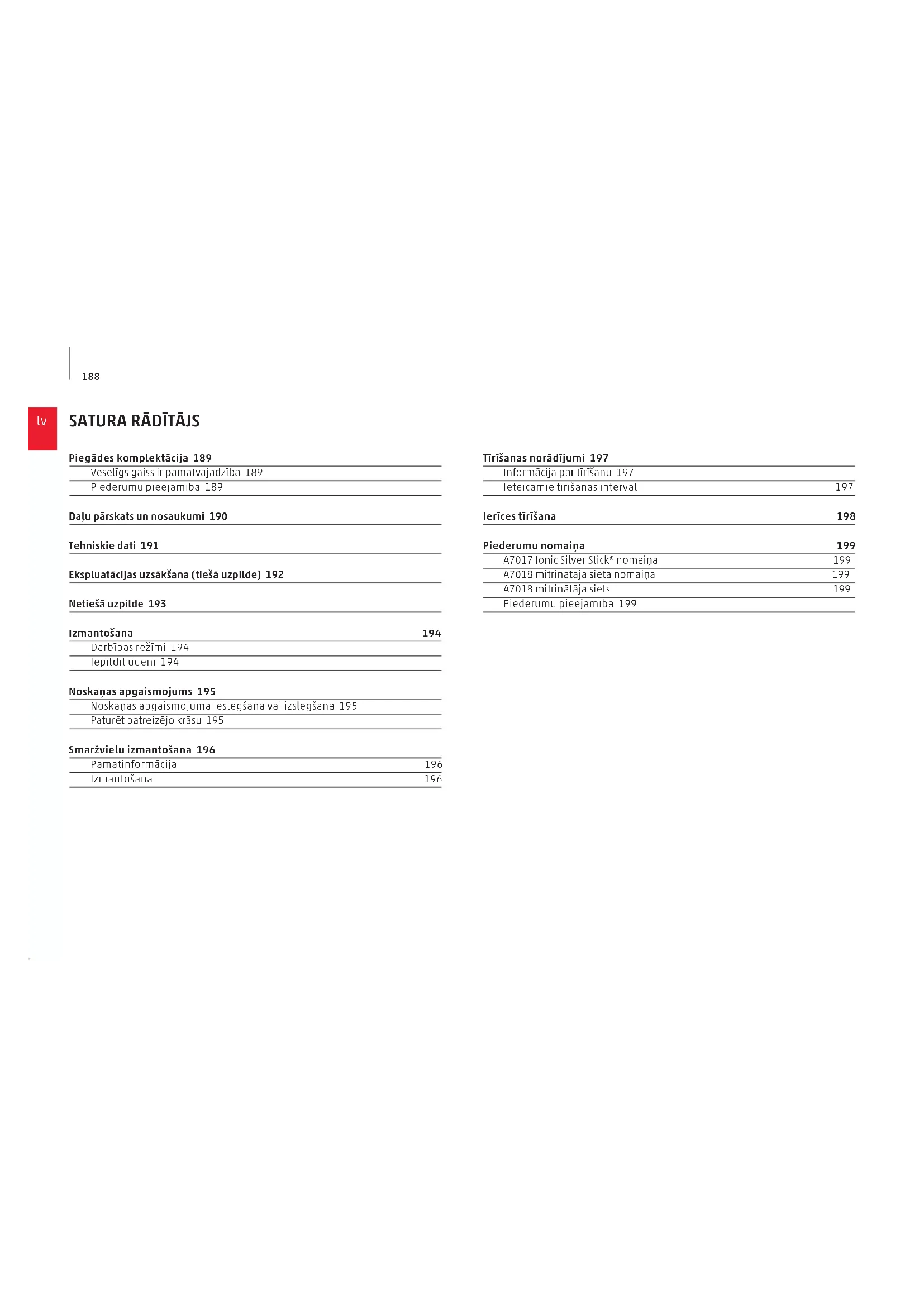 Piegādes komplektācija 189 Veselīgs gaiss ir pamatvajadzība 189 Piederumu pieejamība 189 Daļu pārskats un nosaukumi 190 Tehniskie dati 191 Ekspluatācijas uzsākšana (tiešā uzpilde) 192 Netiešā uzpilde 193 Izmantošana 194 Darbības režīmi 194 Iepildīt ūdeni 194 Noskaņas apgaismojums 195 Noskaņas apgaismojuma ieslēgšana vai izslēgšana 195 Paturēt patreizējo krāsu 195 Smaržvielu izmantošana 196 Pamatinformācija 196 Izmantošana 196 Tīrīšanas norādījumi 197 Informācija par tīrīšanu 197 Ieteicamie tīrīšanas intervāli 197 Ierīces tīrīšana 198 Piederumu nomaiņa 199 A7017 Ionic Silver Stick® nomaiņa 199 A7018 mitrinātāja sieta nomaiņa 199 A7018 mitrinātāja siets 199 Piederumu pieejamība 199189