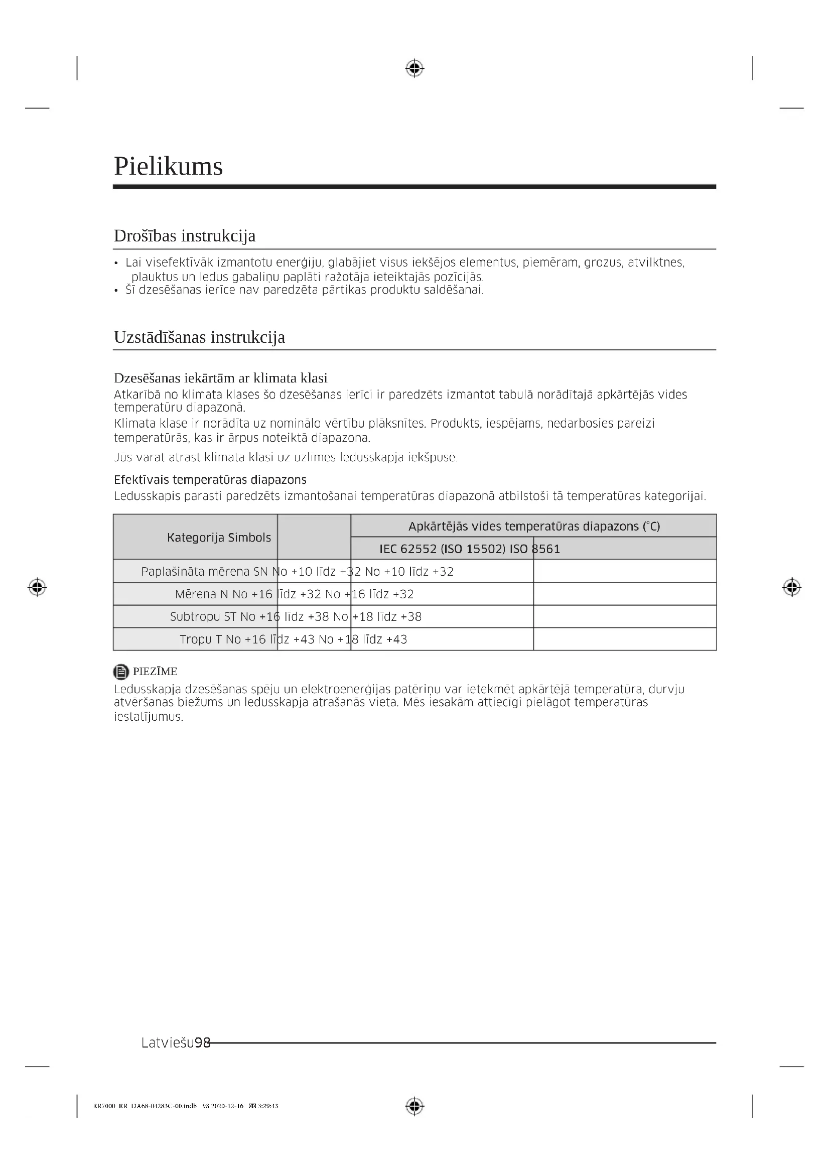 Paplašināta mērena SN No +10 līdz +32 No +10 līdz +32 Mērena N No +16 līdz +32 No +16 līdz +32 Subtropu ST No +16 līdz +38 No +18 līdz +38 Tropu T No +16 līdz +43 No +18 līdz +43 PIEZĪME Ledusskapja dzesēšanas spēju un elektroenerģijas patēriņu var ietekmēt apkārtējā temperatūra, durvju atvēršanas biežums un ledusskapja atrašanās vieta. Mēs iesakām attiecīgi pielāgot temperatūras iestatījumus. RR7000_RR_DA68-04283C-00.indb 98 2020-12-16 3:29:43Latviešu 99 Temperatūras instrukcija Ieteicamā temperatūra Optimālais temperatūras iestatījums pārtikas glabāšanai:
