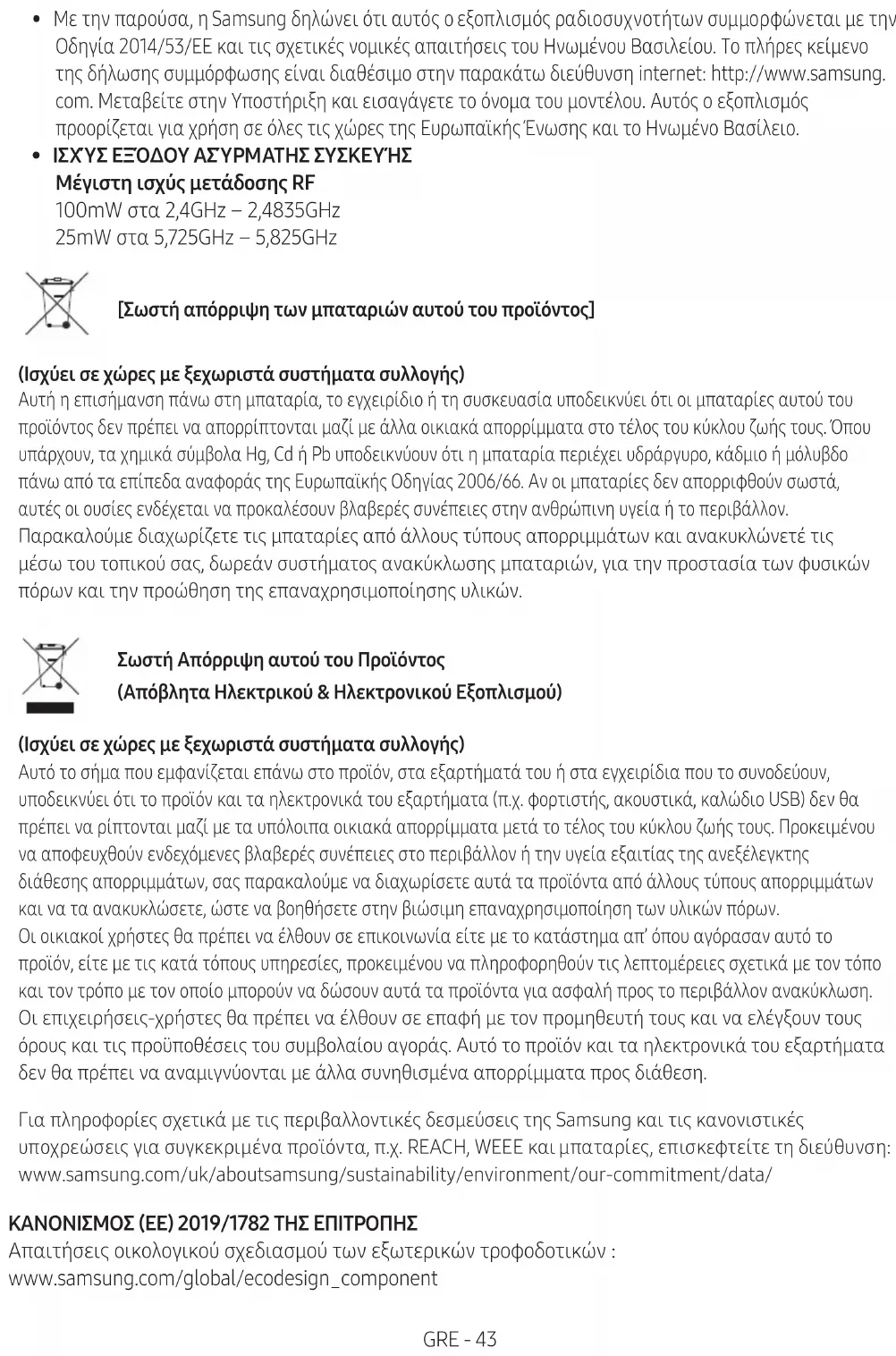 - BEZVADU IERĪCES IZEJAS JAUDA RF raidītāja maksimālā jauda 100 mW, 2,4 GHz – 2,4835 GHz 25 mW, 5,725 GHz – 5,825 GHz [Pareiza atbrīvošanās no šī izstrādājuma baterijām] (Attiecas uz valstīm, kur tiek izmantotas atsevišķas savākšanas sistēmas.) Šis marķējums uz baterijas, rokasgrāmatas vai iepakojuma norāda, ka pēc šajā izstrādājumā ietverto bateriju kalpošanas laika beigām no tām nedrīkst atbrīvoties kopā ar sadzīves atkritumiem. Ja ir atzīmēti ķīmiskie simboli Hg, Cd vai Pb, baterija satur dzīvsudrabu, kadmiju vai svinu tādā līmenī, kas pārsniedz Direktīvā 2006/66/EK noteiktos standartlīmeņus. Ja baterijas netiek pareizi izmestas, šīs vielas var nodarīt kaitējumu cilvēku veselībai vai videi. Lai aizsargātu dabas resursus un veicinātu materiālu atkārtotu lietošanu, lūdzu, nodaliet baterijas no citu veidu atkritumiem un nododiet tās pārstrādei atbilstoši vietējai bezmaksas bateriju pārstrādes sistēmai. Pareiza atbrīvošanās no šī izstrādājuma (elektriskā un elektroniskā aprīkojuma atkritumi) (Attiecas uz valstīm, kur tiek izmantotas atsevišķas savākšanas sistēmas.) Šis marķējums uz izstrādājuma, piederumiem vai dokumentācijas norāda, ka pēc izstrādājuma kalpošanas laika beigām no izstrādājuma un tā elektroniskajiem piederumiem (piemēram, lādētāja, austiņām, USBkabeļa) nedrīkst atbrīvoties kopā ar sadzīves atkritumiem. Lai nepieļautu iespējamu kaitējumu apkārtējai videi vai cilvēku veselībai nekontrolētas atkritumu likvidēšanas dēļ, atdaliet šos priekšmetus no citu veidu atkritumiem un utilizējiet tos atbilstoši prasībām, tādējādi veicinot materiālo resursu ilgtspējīgu atkārtoto izmantošanu. Lai saņemtu detalizētu informāciju par to, kur un kā var nogādāt šos priekšmetus, lai tos pārstrādātu videi draudzīgā veidā, mājsaimniecību lietotājiem ir jāsazinās ar mazumtirgotāju, no kura viņi iegādājās šo izstrādājumu, vai vietējo valsts iestādi. Komerclietotājiem ir jāsazinās ar piegādātāju un jāiepazīstas ar pirkšanas līguma noteikumiem un nosacījumiem. Šo izstrādājumu un tā elektroniskos piederumus nedrīkst sajaukt ar citiem likvidējamiem uzņēmuma atkritumiem. Informāciju par uzņēmuma Samsung saistībām vides aizsardzības jomā un ar izstrādājumu saistītajiem tiesību aktos noteiktajiem pienākumiem, piemēram, REACH, WEEE, Akumulatori, skatiet vietnē: www.samsung.com/uk/aboutsamsung/sustainability/environment/our-commitment/data/