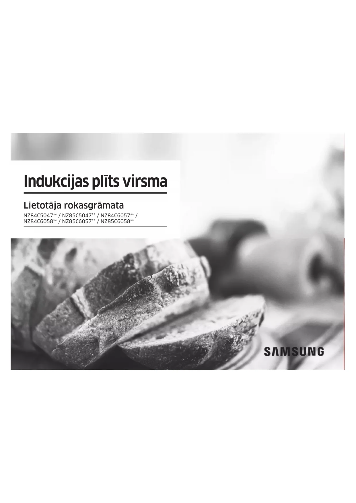 - (opłata według taryfy operatora) http://www.samsung.com/pl/ support/ LITHUANIA 8-800-77777 www.samsung.com/lt/support LATVIA 8000-7267 www.samsung.com/lv/support ESTONIA 800-7267 www.samsung.com/ee/supportIndukcijas plīts virsma Lietotāja rokasgrāmata NZ84C5047** / NZ85C5047** / NZ84C6057** / NZ84C6058** / NZ85C6057** / NZ85C6058**2 Latviešu Saturs Saturs Taimeris 21 Pauze/Atsākt 22 Ātrā apstāšanās 22 Bērnu drošības slēdzene 22 Maksimālās jaudas ierobežojums 23 Skaņa ir ieslēgta/izslēgta 23 Viedais savienojums 23 Tvaika nosūcēja kontrole 24 Darbība (NZ8*****8**) 24 Ierīces ieslēgšana 24 Ierīces izslēgšana 24 Gatavošanas zonas un jaudas līmeņa izvēle 24 Maksimālais pastiprinājums 25 Adaptīvās zonas izmantošana (tikai modeļiem ar Adaptīvo zonu) 25 Adaptīvā zona Plus (tikai Adaptīvās zonas Plus lietotajiem modeļiem) 26 Saglabāt siltumu 27 Taimeris 27 Pauze/Atsākt 27 Ātrā apstāšanās 27 Bērnu drošības slēdzene 28 Maksimālās jaudas ierobežojums 28 Skaņa ir ieslēgta/izslēgta 28 Viedais savienojums 29 Tvaika nosūcēja kontrole 29 Jūsu ierīces apkope 30 Plīts 30 Nelieli traipi 30 Noturīgi netīrumi 30 Problemātiski netīrumi 31 Plīts rāmis (papildus opcija) 31 Lai nesabojātu ierīci 31 Problēmu novēršana un apkope 32 Problēmu novēršana 32 Apkope 33 Saturs Šīs rokasgrāmatas izmantošana 3 Šajā Lietotāja rokasgrāmatā tiek izmantoti sekojoši simboli: 3 Modeļa nosaukums un sērijas numurs 3 Drošības instrukcijas 3 Iepakojuma materiāla utilizēšana 7 Pareiza jūsu vecās ierīces utilizācija 7 Izstrādājuma pareiza likvidēšana (Attiecas uz nolietotām elektriskām un elektroniskām ierīcēm) 7 Plīts virsmas uzstādīšana 8 Drošības norādījumi uzstādītājam 8 Nepieciešamie instrumenti 8 Savienošana ar strāvas padevi 8 Uzstādīšana darba virsmā 9 Komponentes 11 Pirms sākt 11 Ēdiena gatavošanas zonas 11 Vadības panelis 13 Sildīšana ar indukciju 14 Drošības izslēgšanās 15 Atlikušā siltuma daudzuma rādītājs 15 Temperatūras noteikšana 15 Ēdiena gatavošanas trauki 16 Izmantojot skārienpogas 19 Darbības trokšņi 19 Sākotnējā tīrīšana 19 Darbība (NZ8*****7**) 19 Ierīces ieslēgšana 19 Ierīces izslēgšana 19 Gatavošanas zonas un jaudas līmeņa izvēle 19 Maksimālais pastiprinājums 20 Adaptīvās zonas izmantošana: 20 Adaptīvā zona Plus (tikai Adaptīvās zonas Plus lietotajiem modeļiem) 21Latviešu 3 Šīs rokasgrāmatas izmantošana Šīs rokasgrāmatas izmantošana Pirms ierīces lietošanas, lūdzu, veltiet laiku, lai izlasītu šo lietotāja rokasgrāmatu, īpašu uzmanību pievēršot drošības informācijai, kas ietverta nākamajā sadaļā. Saglabājiet šo rokasgrāmatu turpmākai uzziņai. Ja nododat ierīci jaunam īpašniekam, lūdzu, neaizmirstiet nodot tam arī šo rokasgrāmatu. Šajā Lietotāja rokasgrāmatā tiek izmantoti sekojoši simboli: