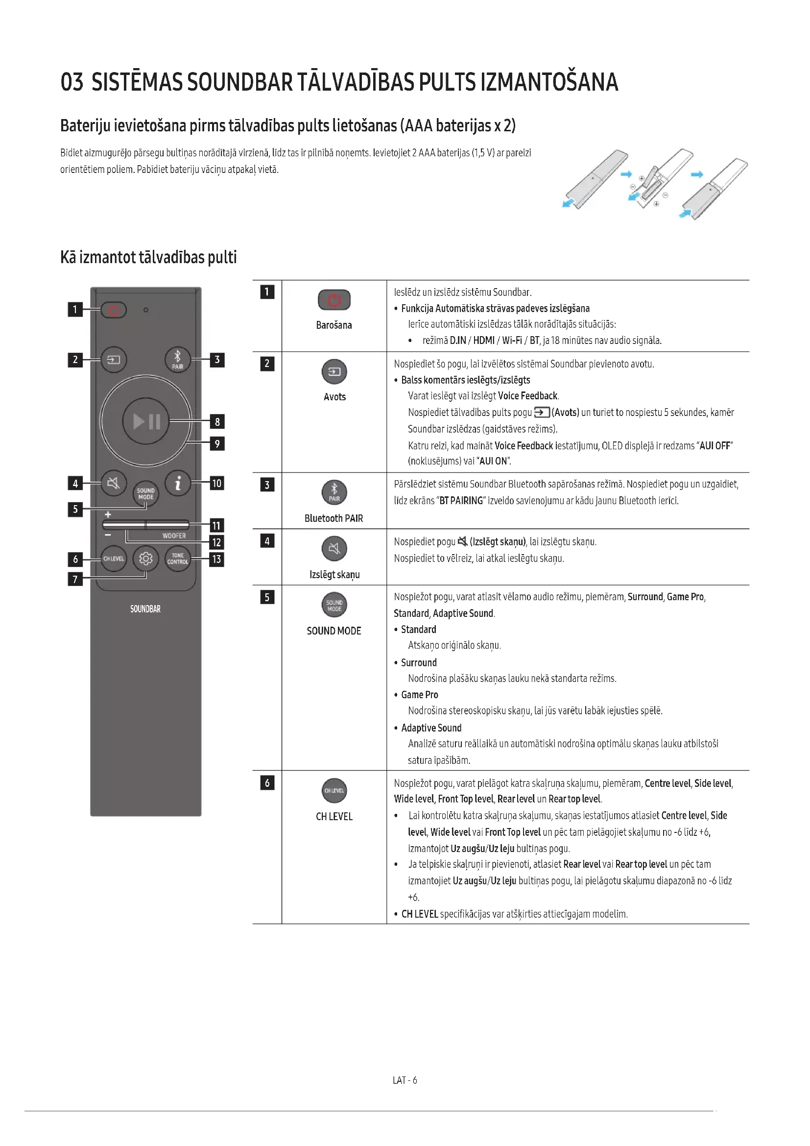 - Šo ierīci vai citus komponentus nedrīkst pievienot maiņstrāvas kontaktligzdai, līdz ir izveidoti visi savienojumi starp komponentiem.LAT - 6 03 SISTĒMAS SOUNDBAR TĀLVADĪBAS PULTS IZMANTOŠANA Bateriju ievietošana pirms tālvadības pults lietošanas (AAA baterijas x 2) Bīdiet aizmugurējo pārsegu bultiņas norādītajā virzienā, līdz tas ir pilnībā noņemts. Ievietojiet 2 AAA baterijas (1,5 V) ar pareizi orientētiem poliem. Pabīdiet bateriju vāciņu atpakaļ vietā. Kā izmantot tālvadības pulti SOUNDBAR