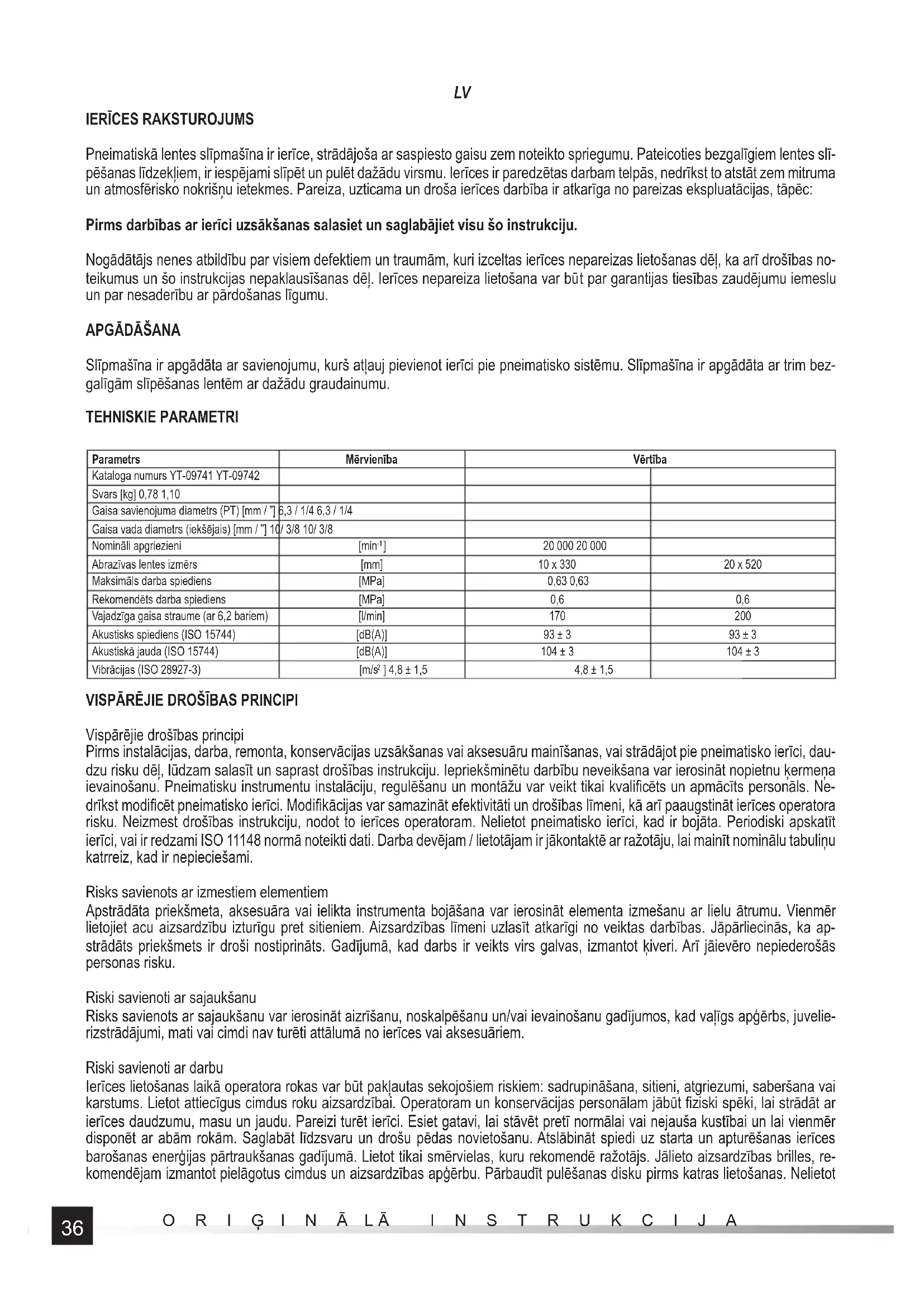 Slīpmašīna ir apgādāta ar savienojumu, kurš atļauj pievienot ierīci pie pneimatisko sistēmu. Slīpmašīna ir apgādāta ar trim bez- galīgām slīpēšanas lentēm ar dažādu graudainumu. TEHNISKIE PARAMETRI Parametrs Mērvienība Vērtība Kataloga numurs YT-09741 YT-09742 Svars [kg] 0,78 1,10 Gaisa savienojuma diametrs (PT) [mm / ”] 6,3 / 1/4 6,3 / 1/4 Gaisa vada diametrs (iekšējais) [mm / ”] 10/ 3/8 10/ 3/8 Nomināli apgriezieni [min