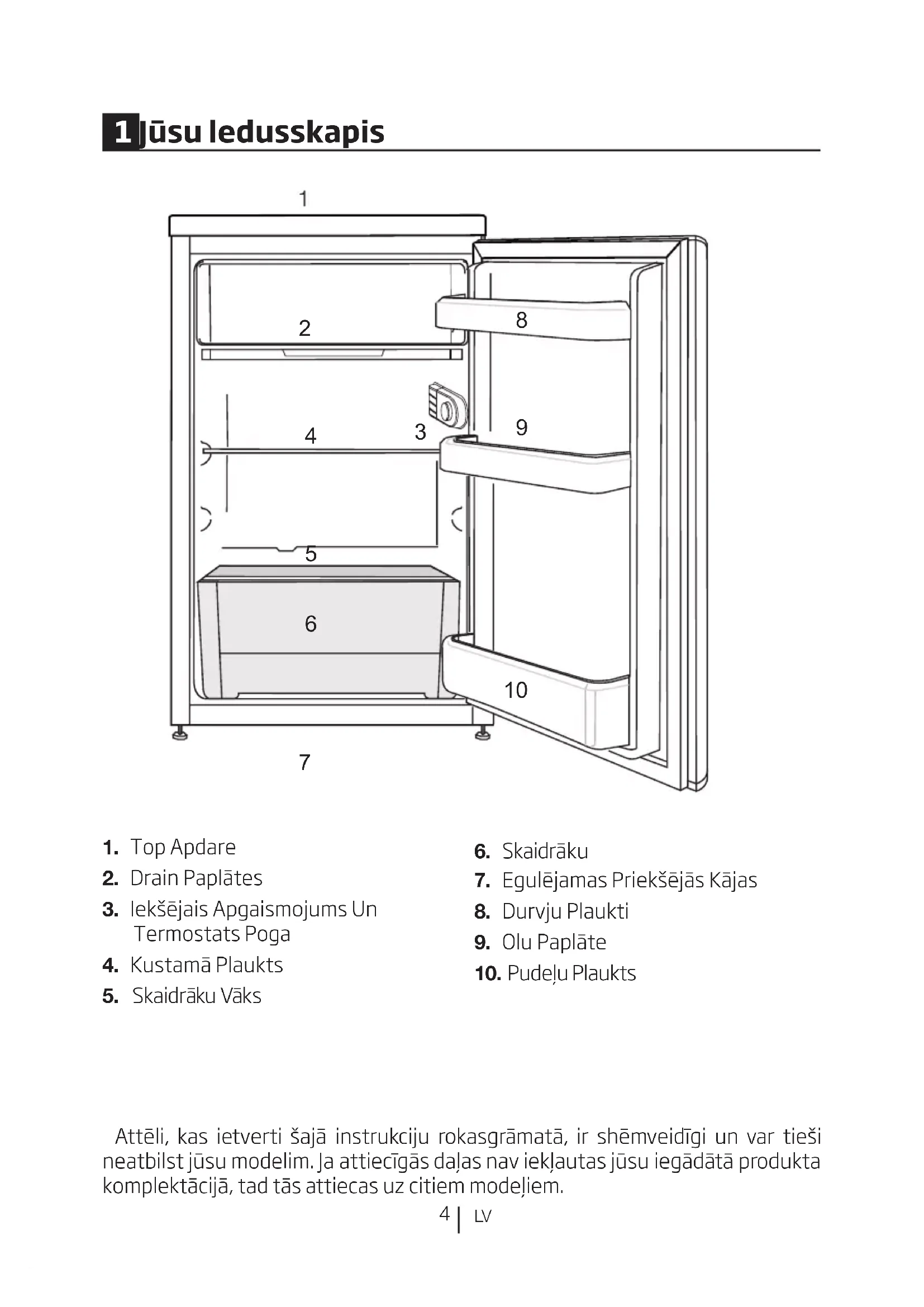 Attēli, kas ietverti šajā instrukciju rokasgrāmatā, ir shēmveidīgi un var tieši neatbilst jūsu modelim. Ja attiecīgās daļas nav iekļautas jūsu iegādātā produkta komplektācijā, tad tās attiecas uz citiem modeļiem. 1 Jūsu ledusskapis