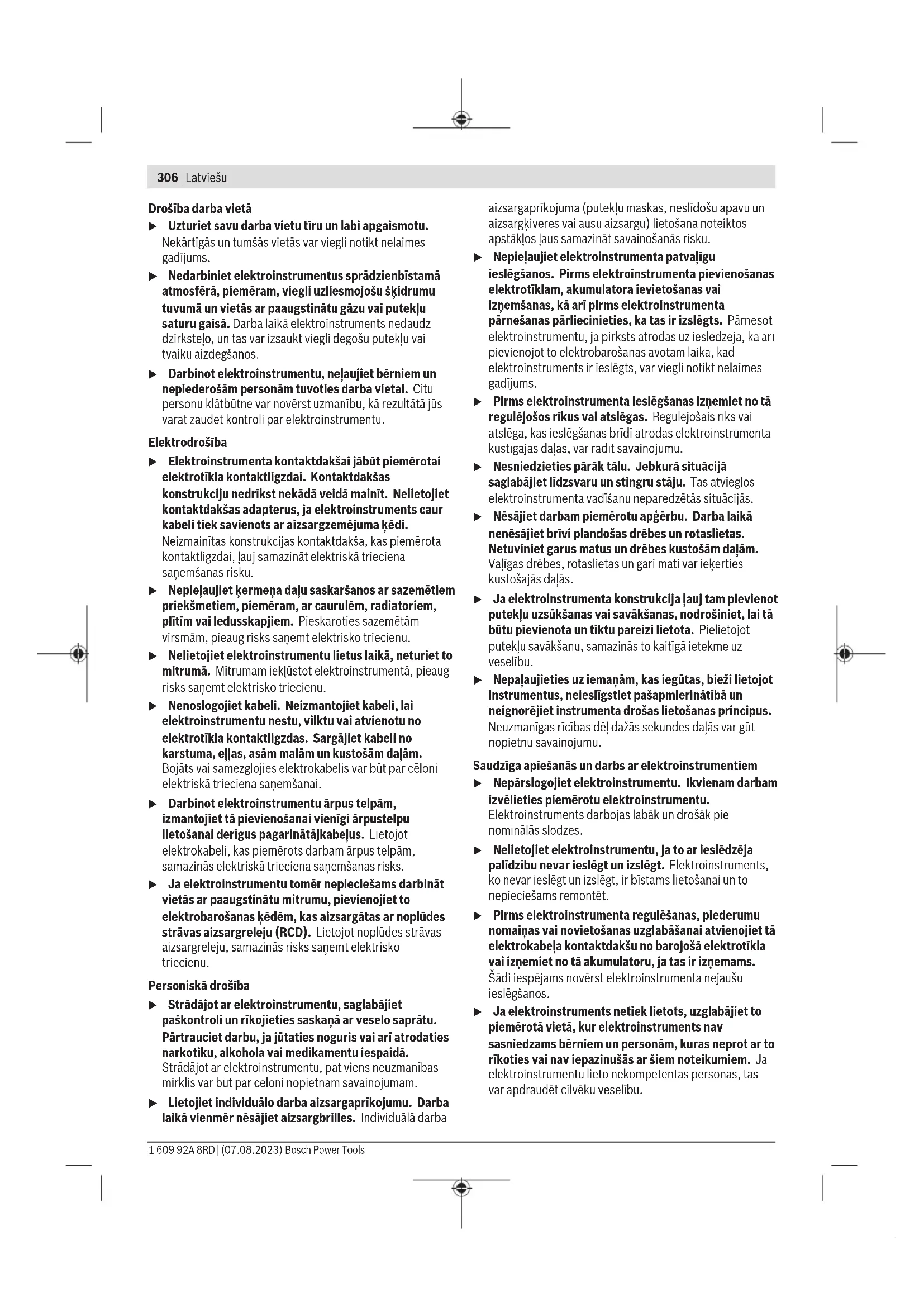 Šajā pamācībā norādītais vibrācijas līmenis un instrumenta radītā trokšņa vērtība ir izmērīta atbilstoši standartā noteiktajai procedūrai un var tikt izmantota elektroinstrumentu savstarpējai salīdzināšanai. To var izmantot arī vibrācijas un trokšņa radītās papildu slodzes iepriekšējai novērtēšanai. Šeit norādītais svārstību līmenis un instrumenta radītā trokšņa vērtība ir attiecināma uz elektroinstrumenta galvenajiem pielietojuma veidiem. Ja elektroinstruments tiek lietots netipiskiem mērķiem, kopā ar netipiskiem darbinstrumentiem vai nav vajadzīgajā veidā apkalpots, tā svārstību līmenis un radītā trokšņa vērtība var atšķirties no šeit norādītajām vērtībām. Tas var ievērojami palielināt svārstību un trokšņa radīto papildu slodzi kopējam darba laika posmam. Lai precīzi izvērtētu svārstību un trokšņa radīto papildu slodzi zināmam darba laika posmam, jāņem vērā arī laiks, kad elektroinstruments ir izslēgts vai arī darbojas, taču faktiski netiek izmantots paredzētā darba veikšanai. Tas var ievērojami samazināt svārstību un trokšņa radīto papildu slodzi kopējam darba laika posmam. Veiciet papildu pasākumus, lai pasargātu strādājošo personu no vibrācijas kaitīgās iedarbības, piemēram, savlaicīgi veiciet elektroinstrumenta un darbinstrumentu apkalpošanu, uzturiet rokas siltas un pareizi plānojiet darbu. Akumulators Bosch pārdod akumulatora elektriskos darbinstrumentus arī bez akumulatora. Tas, vai Jūsu elektriskā darbinstrumenta piegādes komplektācijā ir iekļauts akumulators, ir norādīts uz iesaiņojuma. Akumulatora uzlāde u Izmantojiet vienīgi tehniskajos datos norādītās uzlādes ierīces. Vienīgi šī uzlādes ierīce ir piemērota jūsu elektroinstrumentā izmantojamā litija-jonu akumulatora uzlādei. Norāde: atbilstoši starptautiskajiem kravu pārvadāšanas noteikumiem litija jonu akumulatori tiek piegādāti daļēji uzlādētā stāvoklī. Lai nodrošinātu pilnu akumulatora jaudu, pirms pirmās lietošanas reizes pilnībā uzlādējiet akumulatoru. Akumulatora ielikšana Ievietojiet uzlādēto akumulatoru akumulatora stiprinājumā, līdz tas tiek nofiksēts. Akumulatora izņemšana Lai izņemtu akumulatoru, nospiediet akumulatora atbrīvošanas taustiņu un izvelciet akumulatoru. Nedarbojieties ar spēku. Akumulatoram 2 ir divpakāpju fiksators, kas neļauj tam izkrist, kad nejauši nospiež akumulatora atbrīvošanas pogu. Kamēr akumulators ir ielikts elektroinstrumentā, to notur atspere. Akumulatora uzlādes pakāpes indikators Piezīme: ne visiem akumulatoru tipiem ir uzlādes līmeņa indikators. Akumulatora uzlādes pakāpes indikatora zaļās LEDs diodes parāda akumulatora uzlādes pakāpi. Vadoties no drošības apsvērumiem, uzlādes pakāpe ir nolasāma tikai tad, ja elektroinstruments atrodas miera stāvoklī. Lai nolasītu akumulatora uzlādes pakāpi, nospiediet akumulatora uzlādes pakāpes nolasīšanas taustiņu vai . Tas iespējams arī tad, ja akumulators ir izņemts no elektroinstrumenta. Ja pēc akumulatora uzlādes pakāpes nolasīšanas taustiņa nospiešanas neiedegas neviena no uzlādes pakāpes indikatora LED diodēm, tas nozīmē, ka akumulators ir bojāts un to nepieciešams nomainīt. Akumulatora tips GBA 18V... LED Uzlādes līmenis Pastāvīgi deg 3zaļas LED diodes 60–100% Pastāvīgi deg 2zaļas LED diodes 30–60% Pastāvīgi deg 1zaļa LED diode 5–30% Mirgo 1zaļa LED diode 0–5% Bosch Power Tools 1 609 92A 8RD | (07.08.2023)310 | Latviešu Akumulatora tips ProCORE18V... LED Uzlādes līmenis Pastāvīgi deg 5zaļas LED diodes 80–100% Pastāvīgi deg 4zaļas LED diodes 60–80% Pastāvīgi deg 3zaļas LED diodes 40–60% Pastāvīgi deg 2zaļas LED diodes 20–40% Pastāvīgi deg 1zaļa LED diode 5–20% Mirgo 1zaļa LED diode 0–5% Pareiza apiešanās ar akumulatoru Sargājiet akumulatoru no mitruma un ūdens. Uzglabājiet akumulatoru pie temperatūras no −20°C līdz 50°C. Neatstājiet akumulatoru karstumā, piemēram, vasaras laikā neatstājiet to automašīnā. Laiku pa laikam iztīriet akumulatora ventilācijas atvērumus ar mīkstu, tīru un sausu otu. Ja manāmi samazinās instrumenta darbības laiks starp akumulatora uzlādēm, tas norāda, ka akumulators ir nolietojies un to nepieciešams nomainīt. Ievērojiet norādījumus par atbrīvošanos no nolietotajiem izstrādājumiem. Montāža u Veicot jebkurus darbus ar elektroinstrumentu (piemēram, apkalpošanu, darbinstrumentu nomaiņu utt.), kā arī pirms tā transportēšanas vai uzglabāšanas vienmēr izņemiet no elektroinstrumenta akumulatoru. Ieslēdzēja nejauša nospiešana var izraisīt savainojumu. Darbinstrumenta nomaiņa u Nomainot darbinstrumentu, uzvelciet aizsargcimdus. Pieskaršanās nomaināmajiem darbinstrumentiem var radīt savainojumus. Darbinstrumenta izvēle Lūdzam izmantot šim elektroinstrumentam paredzētos darbinstrumentus. Rezerves darbinstruments GOP18V‑34 Sekojošajā tabulā ir parādīti darbinstrumentu lietošanas piemēri. Citus darbinstrumentus var atrast Bosch plašajā piederumu programmā. Iestiprināmais darbinstruments Materiāls Lietojums AIZ 10 AB Starlock 10×20mm bimetāla zāģa asmens gremdzāģējumiem koksnē un metālā Skujkoku koksne, mīksta plastmasa, ģipškartons, alumīnija un krāsaino metālu plānsienu profili, plāns skārds, nerūdītas naglas un skrūves Mazi nozāģēšanas un gremdzāģēšanas darbi; precīza koksnes salāgošana. Piemēri: kabeļa padziļinājuma izzāģēšana, gremdzāģēšana ģipškartona plāksnēs, slēdzeņu un apkalumu padziļinājuma izzāģēšana AIZ 32 EPC Starlock 32×50mmHCS zāģa asmens gremdzāģējumiem koksnē Skujkoku koksne Nozāģēšana un gremdzāģēšana bez izrāvumiem, pateicoties apaļai zāģa malai (Curved-Tec); arī zāģēšana malu tuvumā, stūros un grūti pieejamās vietās. Piemēri: ventilācijas režģa iebūvēšana