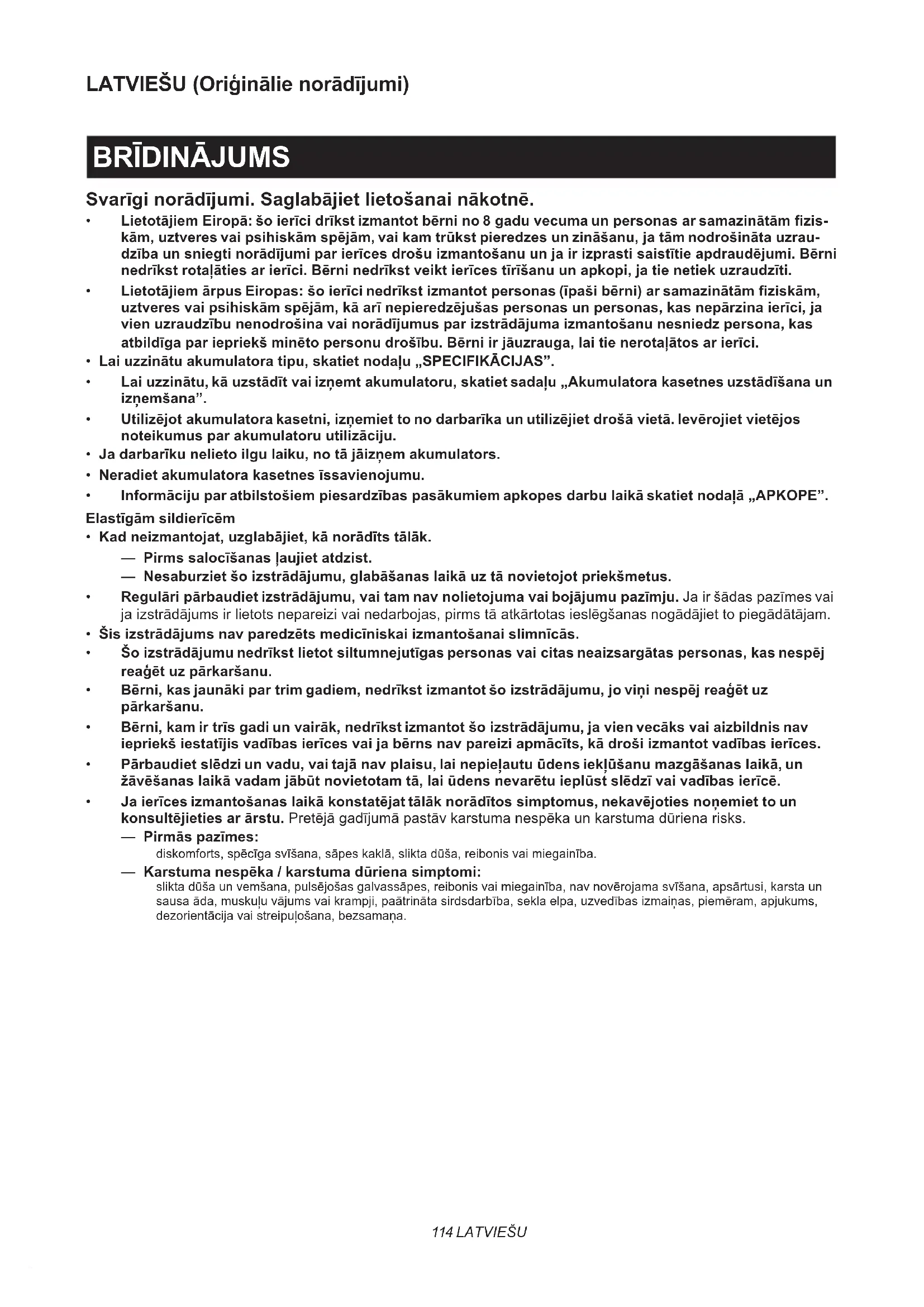 - Lietotājiem ārpus Eiropas: šo ierīci nedrīkst izmantot personas (īpaši bērni) ar samazinātām ziskām, uztveres vai psihiskām spējām, kā arī nepieredzējušas personas un personas, kas nepārzina ierīci, ja vien uzraudzību nenodrošina vai norādījumus par izstrādājuma izmantošanu nesniedz persona, kas atbildīga par iepriekš minēto personu drošību. Bērni ir jāuzrauga, lai tie nerotaļātos ar ierīci.