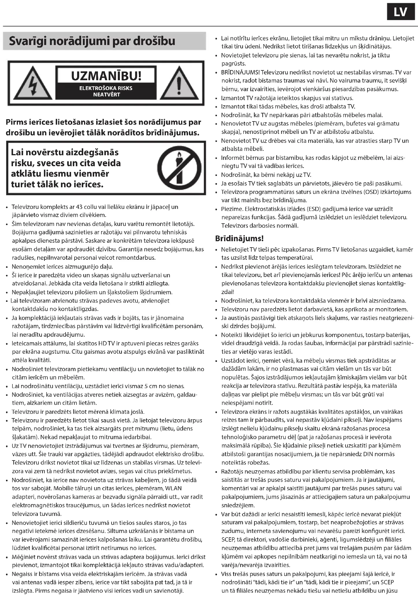 - BRĪDINĀJUMS! Televizoru nedrīkst novietot uz nestabilas virsmas. TV var nokrist, radot bīstamas traumas vai nāvi. No vairuma traumu, it sevišķi bērnu, var izvairīties, ievērojot vienkāršus piesardzības pasākumus.