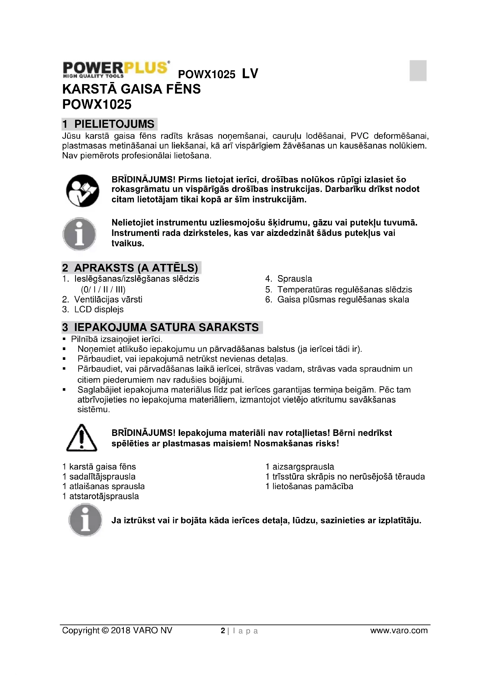 - Nepārtraukts gaisa plūsmas apjomse 500 l/min Ja neesat pārliecināts par pareizajiem iestatījumiem, sāciet ar zemu temperatūras iestatījumu un pakāpeniski paaugstiniet temperatūru līdz optimālu rezultātu sasniegšanaiPOWX1025 LV Copyright © 2018 VARO NV 7 | l a p a www.varo.com