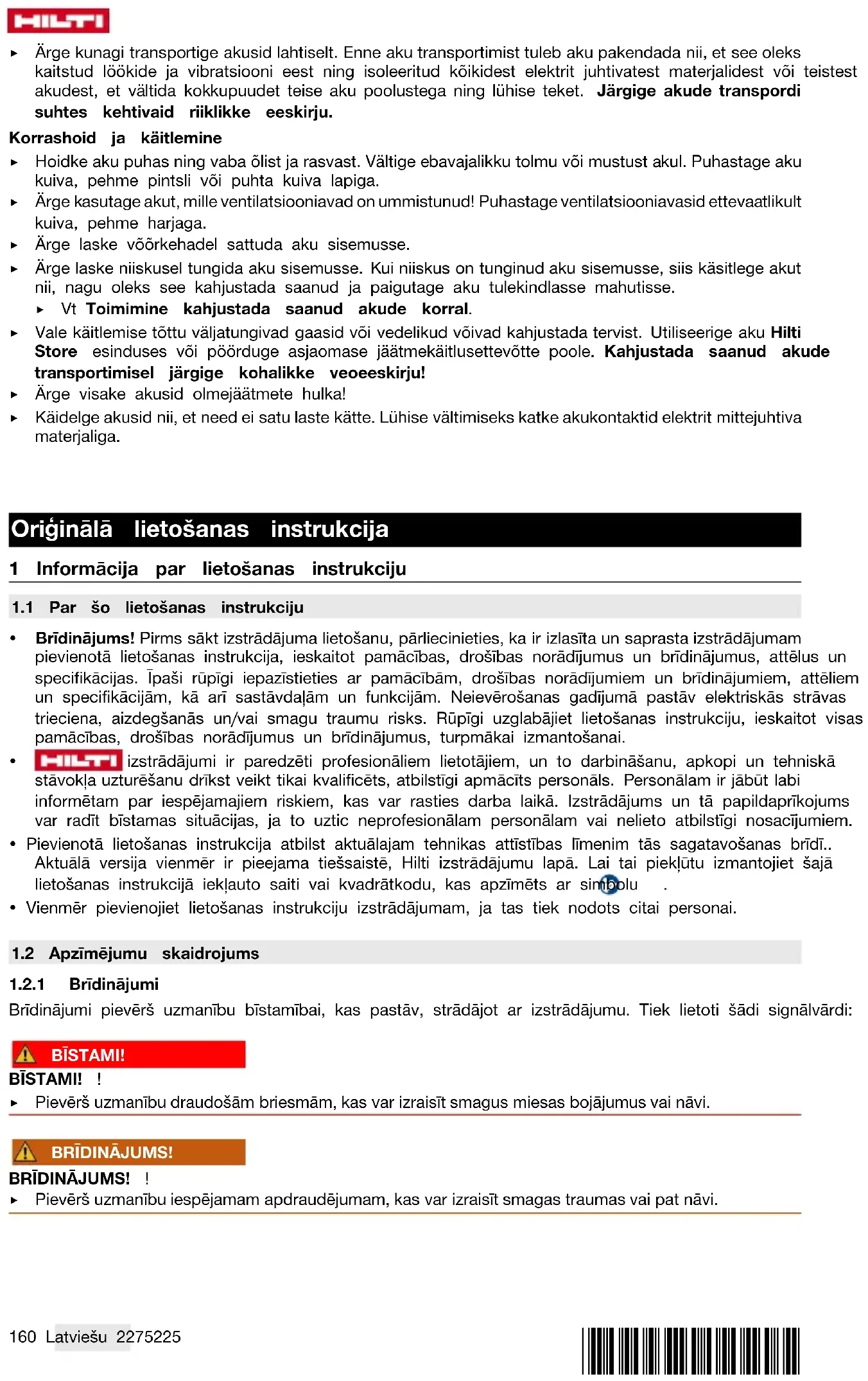 Akumulatorus nekādā gadījumā nedrīkst transportēt nenostiprinātā veidā, sabērtus kaudzēs. Transpor- tēšanas laikā akumulatori jāsargā no triecieniem un vibrācijas, kā arī jāizolē no jebkādiem materiāliem, kam piemīt elektriskā vadītspēja, un citiem akumulatoriem, lai nepieļautu to nonākšanu saskarē ar citu bateriju kontaktiem un īssavienojuma rašanos. Ievērojiet vietējos noteikumus par akumulatoru transportēšanu. Apkope un utilizācija ▶ Raugieties, lai akumulators ir tīrs, un nepieļaujiet tā savārtīšanu ar eļļu un smērvielām. Nepieļaujiet pārmērīgu putekļu un netīrumu uzkrāšanos uz akumulatora virsmām. Notīriet akumulatoru ar sausu, mīkstu otu vai tīru un sausu drāniņu. ▶ Nekādā gadījumā nelietojiet akumulatoru, ja ir nosprostotas tā ventilācijas atveres. Uzmanīgi iztīriet ventilācijas atveres ar sausu, mīkstu birstīti. ▶ Raugieties, lai akumulatora iekšienē neiekļūtu svešķermeņi. ▶ Nepieļaujiet mitruma iekļūšanu akumulatorā. Ja akumulatorā ir iekļuvis mitrums, tas jāuzskata par bojātu un jāizolē, ievietojot nedegoša materiāla tvertnē. ▶ Skat. nodaļu Rīcība akumulatoru bojājumu gadījumā. ▶ Ja utilizācija netiek veikta pareizā veidā, var izplūst kaitīgas gāzes un šķidrumi, kas apdraud veselību. Nododiet akumulatoru utilizācijai jūs apkalpojošajā Hilti Store vai vērsieties pie kompetentā atkritumu apsaimniekošanas uzņēmuma. Ievērojiet vietējos noteikumus par bojātu akumulatoru transportēša- nu! ▶ Neizmetiet akumulatorus sadzīves atkritumos. ▶ Utilizējiet akumulatorus tā, lai tiem nevarētu piekļūt bērni. Lai nepieļautu īssavienojumus, nosedziet pieslēguma kontaktus ar materiālu, kam nepiemīt elektriskā vadītspēja. Originali naudojimo instrukcija 1 Informacija apie naudojimo instrukciją