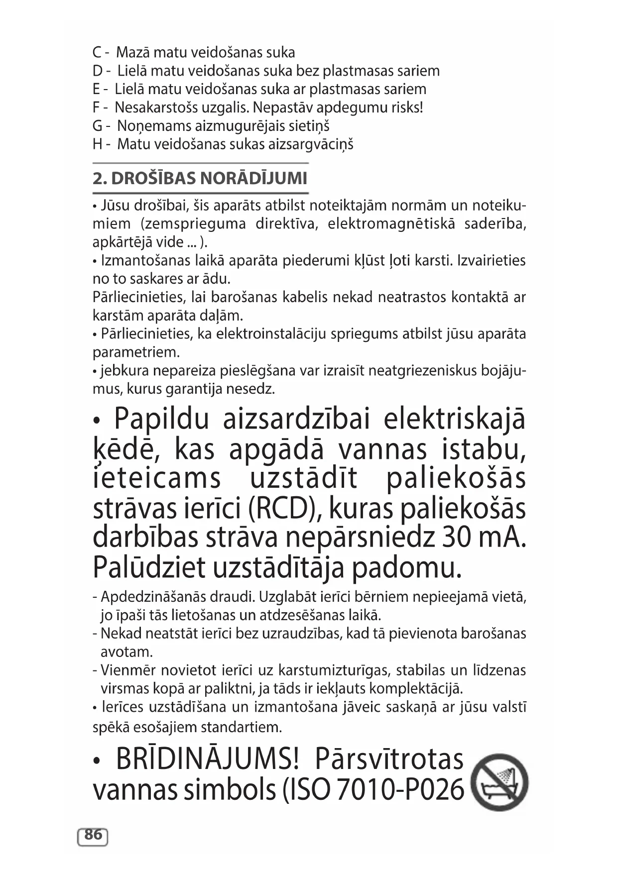 - BRĪDINĀJUMS! Pārsvītrotas vannas simbols (ISO 7010-P02687 (2011-05)) uz ierīces nozīmē to, ka šo ierīci nedrīkst izmantot vannas, dušas, baseina vai citu ūdeni satu- rošu tvertņu tuvumā. Attiecas uz valstīm, kurās nav spēkā Eiropas drošības standarti: