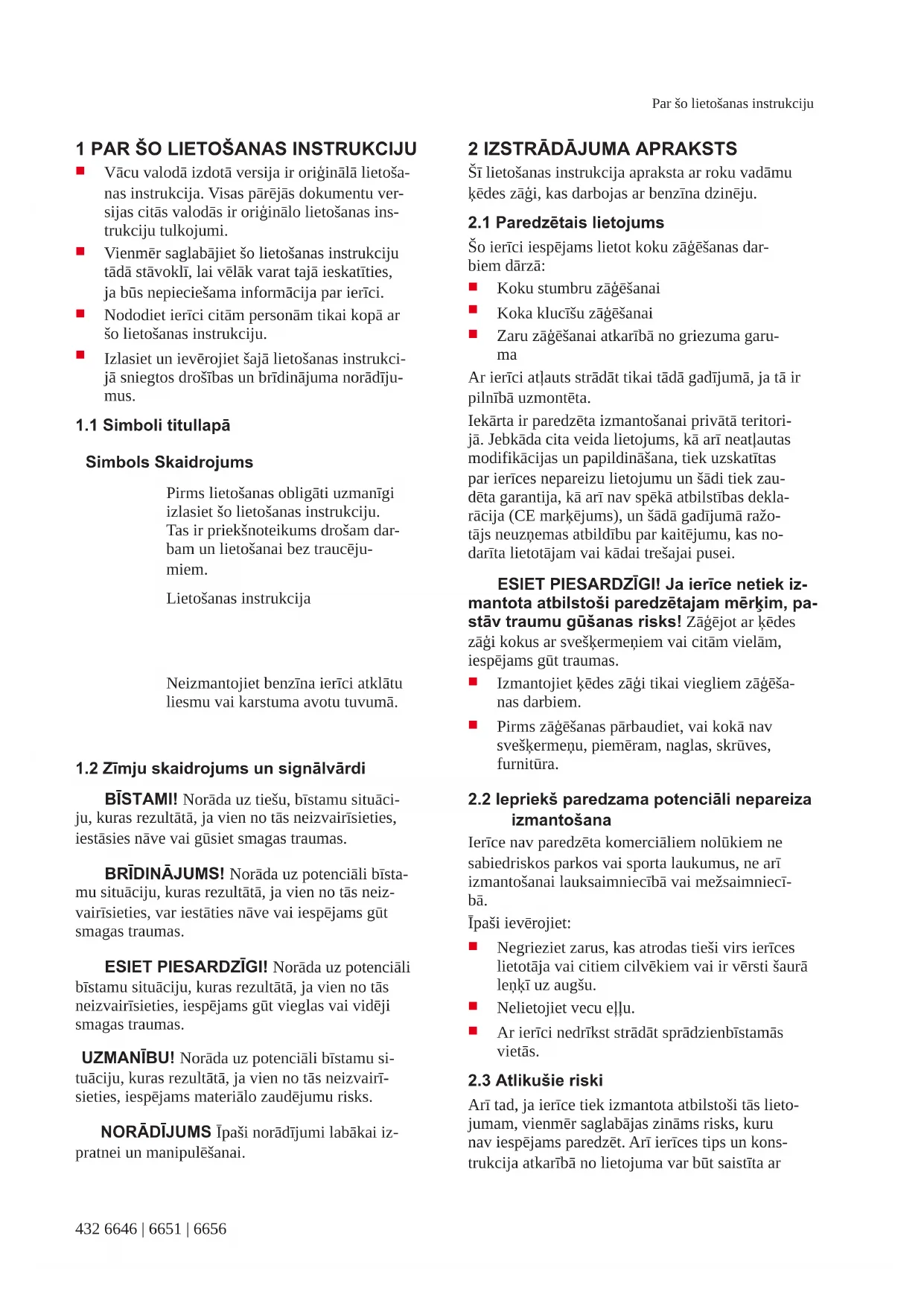 BĪSTAMI! Norāda uz tiešu, bīstamu situāci- ju, kuras rezultātā, ja vien no tās neizvairīsieties, iestāsies nāve vai gūsiet smagas traumas. BRĪDINĀJUMS! Norāda uz potenciāli bīsta- mu situāciju, kuras rezultātā, ja vien no tās neiz- vairīsieties, var iestāties nāve vai iespējams gūt smagas traumas. ESIET PIESARDZĪGI! Norāda uz potenciāli bīstamu situāciju, kuras rezultātā, ja vien no tās neizvairīsieties, iespējams gūt vieglas vai vidēji smagas traumas. UZMANĪBU! Norāda uz potenciāli bīstamu si- tuāciju, kuras rezultātā, ja vien no tās neizvairī- sieties, iespējams materiālo zaudējumu risks. NORĀDĪJUMS Īpaši norādījumi labākai iz- pratnei un manipulēšanai.