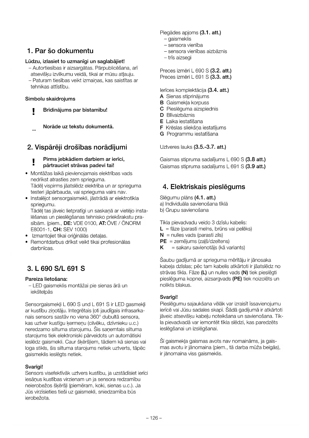 Pareiza lietošana: – LED gaismeklis montāžai pie sienas ārā un iekštelpās Sensorgaismekļi L 690 S und L 691 S ir LED gasmekļi ar kustību ziņotāju. Integrētais ļoti jaudīgais infrasarka- nais sensors sastāv no viena 360° dubultā sensora, kas uztver kustīgu ķermeņu (cilvēku, dzīvnieku u.c.) neredzamo siltuma starojumu. Šis saņemtais siltuma starojums tiek elektroniski pārveidots un automātiski ieslēdz gaismekli. Caur šķēršļiem, tādiem kā sienas vai loga stikls, šis siltuma starojums netiek uztverts, tāpēc gaismeklis ieslēgts netiek. Svarīgi! Sensors visefektīvāk uztvers kustību, ja uzstādīsiet ierīci iesāņus kustības virzienam un ja sensora redzamību neierobežos šķēršļi (piemēram, koki, sienas u.c.). Ja Jūs virzīsieties tieši uz gaismekli, sniedzamība būs ierobežota. Piegādes apjoms (3.1. att.) – gaismeklis – sensora vienība – sensora vienības aizbāznis – trīs aizsegi Preces izmēri L690 S (3.2. att.) Preces izmēri L691 S (3.3. att.) Ierīces komplektācija (3.4. att.) A Sienas stiprinājums B Gaismekļa korpuss C Pieslēguma aizspiednis D Blīvaizbāznis E Laika iestatīšana F Krēslas sliekšņa iestatījums G Programmu iestatīšana Uztveres lauks (3.5.-3.7. att.) Gaismas stipruma sadalījums L 690 S (3.8 att.) Gaismas stipruma sadalījums L 691 S (3.9 att.)