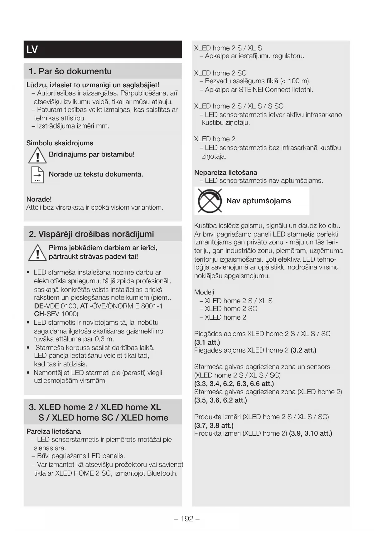 S/XLEDhome SC/XLEDhome Pareiza lietošana – LED sensorstarmetis ir piemērots motāžai pie sienas ārā. – Brīvi pagriežams LED panelis. – Var izmantot kā atsevišķu prožektoru vai savienot tīklā ar XLED HOME 2 SC, izmantojot Bluetooth. XLEDhome2 S/XL S – Apkalpe ar iestatījumu regulatoru. XLEDhome2 SC – Bezvadu saslēgums tīklā (<100m). – Apkalpe ar STEINEl Connect lietotni. XLED home 2 S/XL S/S SC – LED sensorstarmetis ietver aktīvu infrasarkano kustību ziņotāju. XLED home 2 – LED sensorstarmetis bez infrasarkanā kustību ziņotāja. Nepareiza lietošana – LED sensorstarmetis nav aptumšojams. Nav aptumšojams Kustība ieslēdz gaismu, signālu un daudz ko citu. Ar brīvi pagriežamo paneli LED starmetis perfekti izmantojams gan privāto zonu - māju un tās teri- toriju, gan industriālo zonu, piemēram, uzņēmuma teritoriju izgaismošanai. Ļoti efektīvā LED tehno- loģija savienojumā ar opālstiklu nodrošina virsmu noklājošu apgaismojumu. Modeļi – XLEDhome2 S/XL S – XLEDhome2SC – XLEDhome2 Piegādes apjoms XLED home 2 S/XL S/SC (3.1 att.) Piegādes apjoms XLEDhome2 (3.2 att.) Starmeša galvas pagrieziena zona un sensors (XLED home 2 S/XL S/SC) (3.3,3.4,6.2,6.3,6.6 att.) Starmeša galvas pagrieziena zona (XLEDhome2) (3.5,3.6,6.2 att.) Produkta izmēri (XLED home 2 S/XL S/SC) (3.7,3.8 att.) Produkta izmēri (XLEDhome2) (3.9,3.10 att.)– 193 –