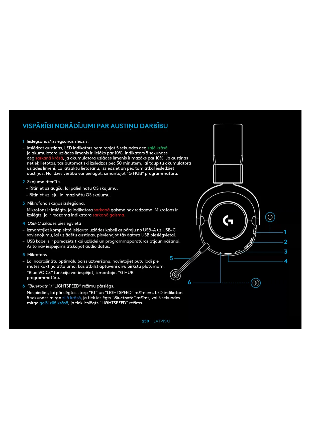 1 Peakomplekt peab olema režiimis LIGHTSPEED. 2 Ühendage komplekti kuuluva 3,5 mm kaabli üks otsjuhtmevaba adapteri LIGHTSPEED 3,5 mm porti.249 EESTI 3 Ühendage komplekti kuuluva 3,5 mm kaabli teine otsheliallika, mida te soovite juhtmevabaks signaaliks MUXida, 3,5 mm porti. MUXitud allikas jääb püsiva helitugevuse juurde, samas kui juhtmevaba signaali helitugevust saab helitugevusrattaga reguleerida. music video pictures social radio podcasts marketplace250 LATVISKI VISPĀRĪGI NORĀDĪJUMI PAR AUSTIŅU DARBĪBU 1 Ieslēgšanas/izslēgšanas slēdzis. – Ieslēdzot austias, LED indikators nemirgojot 5 sekundes deg zaā krāsā, jaakumulatora uzlādes līmenis ir lielāks par 10%. Indikators 5 sekundes degsarkanā krāsā, ja akumulatora uzlādes līmenis ir mazāks par 10%. Ja austias netiek lietotas, tās automātiski izslēdzas pēc 30 minūtēm, lai taupītu akumulatora uzlādes līmeni. Lai atsāktu lietošanu, izslēdziet un pēc tam atkal ieslēdziet austias. Noildzes vērtību var pielāgot, izmantojot “G HUB” programmatūru. 2 Skauma ritenītis. – Ritiniet uz augšu, lai palielinātu OS skaumu. – Ritiniet uz leju, lai mazinātu OS skaumu. 3 Mikrofona skaas izslēgšana. – Mikrofons ir ieslēgts, ja indikatora sarkanā gaisma nav redzama. Mikrofons ir izslēgts, ja ir redzama indikatora sarkanā gaisma. 4 USB-C uzlādes pieslēgvieta – Izmantojiet komplektā iekauto uzlādes kabeli ar pāreju no USB-A uz USB-C savienojumu, lai uzlādētu austias, pievienojot tās datora USB pieslēgvietai. – USB kabelis ir paredzēts tikai uzlādei un programmaparatūras atjaunināšanai. Arto nav iespējams atskaot audio datus. 5 Mikrofons – Lai nodrošinātu optimālu balss uztveršanu, novietojiet putu lodi pie mutes kaktia attālumā, kas atbilst aptuveni divu pirkstu platumam. – “Blue VO!CE” funkciju var iespējot, izmantojot “G HUB” programmatūru. 6 “Bluetooth”/“LIGHTSPEED” režīmu pārslēgs. – Nospiediet, lai pārslēgtos starp “BT” un “LIGHTSPEED” režīmiem. LED indikators 5sekundes mirgo zilā krāsā, ja tiek ieslēgts “Bluetooth” režīms, vai 5 sekundes mirgo gaiši zilā krāsā, ja tiek ieslēgts “LIGHTSPEED” režīms.