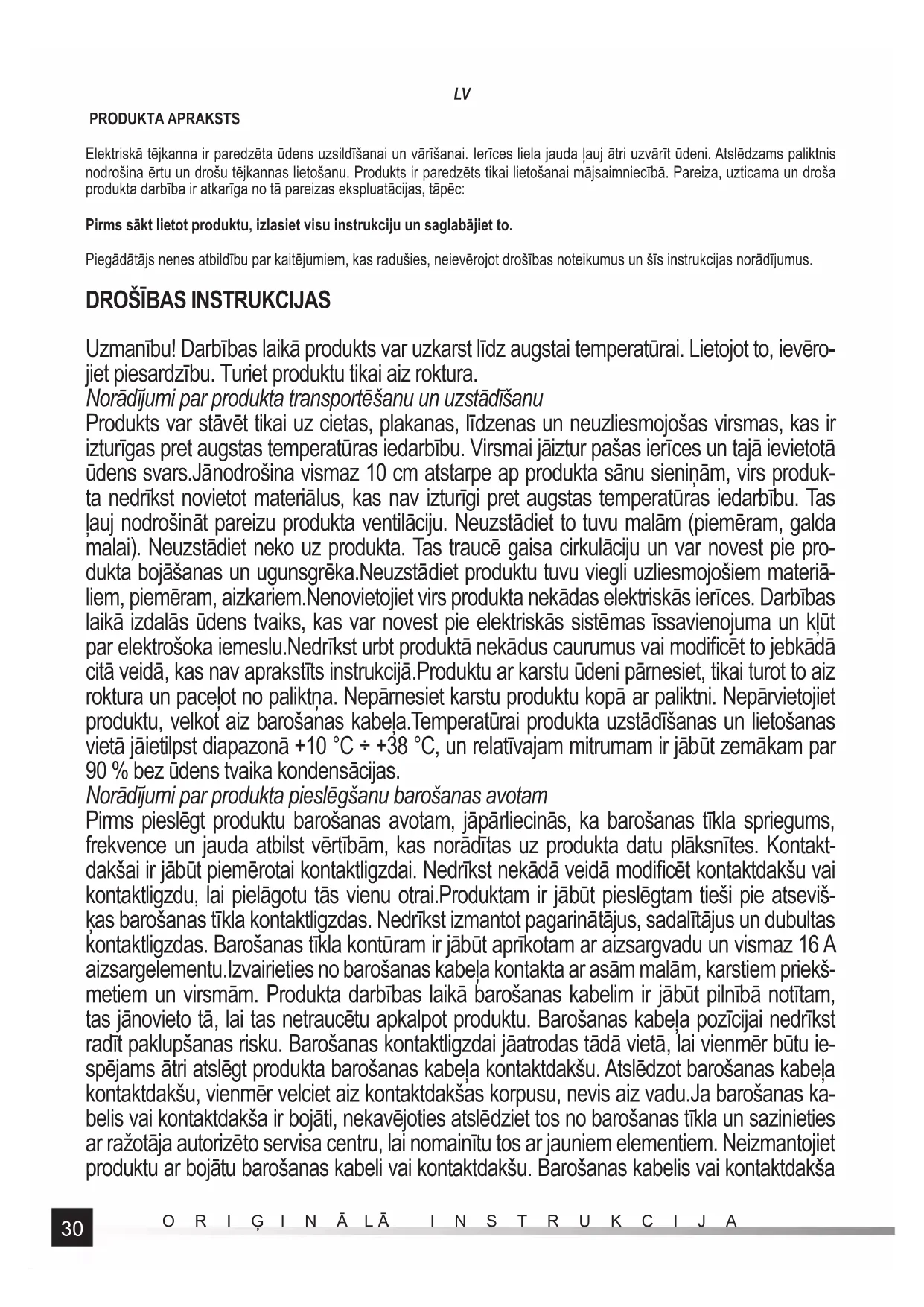 Uzmanību! Darbības laikā produkts var uzkarst līdz augstai temperatūrai. Lietojot to, ievēro- jiet piesardzību. Turiet produktu tikai aiz roktura. Norādījumi par produkta transportēšanu un uzstādīšanu Produkts var stāvēt tikai uz cietas, plakanas, līdzenas un neuzliesmojošas virsmas, kas ir izturīgas pret augstas temperatūras iedarbību. Virsmai jāiztur pašas ierīces un tajā ievietotā ūdens svars.Jānodrošina vismaz 10 cm atstarpe ap produkta sānu sieniņām, virs produk- ta nedrīkst novietot materiālus, kas nav izturīgi pret augstas temperatūras iedarbību. Tas ļauj nodrošināt pareizu produkta ventilāciju. Neuzstādiet to tuvu malām (piemēram, galda malai). Neuzstādiet neko uz produkta. Tas traucē gaisa cirkulāciju un var novest pie pro- dukta bojāšanas un ugunsgrēka.Neuzstādiet produktu tuvu viegli uzliesmojošiem materiā- liem, piemēram, aizkariem.Nenovietojiet virs produkta nekādas elektriskās ierīces. Darbības laikā izdalās ūdens tvaiks, kas var novest pie elektriskās sistēmas īssavienojuma un kļūt par elektrošoka iemeslu.Nedrīkst urbt produktā nekādus caurumus vai modifi cēt to jebkādā citā veidā, kas nav aprakstīts instrukcijā.Produktu ar karstu ūdeni pārnesiet, tikai turot to aiz roktura un paceļot no paliktņa. Nepārnesiet karstu produktu kopā ar paliktni. Nepārvietojiet produktu, velkot aiz barošanas kabeļa.Temperatūrai produkta uzstādīšanas un lietošanas vietā jāietilpst diapazonā +10 °C ÷ +38 °C, un relatīvajam mitrumam ir jābūt zemākam par 90 % bez ūdens tvaika kondensācijas. Norādījumi par produkta pieslēgšanu barošanas avotam Pirms pieslēgt produktu barošanas avotam, jāpārliecinās, ka barošanas tīkla spriegums, frekvence un jauda atbilst vērtībām, kas norādītas uz produkta datu plāksnītes. Kontakt- dakšai ir jābūt piemērotai kontaktligzdai. Nedrīkst nekādā veidā modifi cēt kontaktdakšu vai kontaktligzdu, lai pielāgotu tās vienu otrai.Produktam ir jābūt pieslēgtam tieši pie atseviš- ķas barošanas tīkla kontaktligzdas. Nedrīkst izmantot pagarinātājus, sadalītājus un dubultas kontaktligzdas. Barošanas tīkla kontūram ir jābūt aprīkotam ar aizsargvadu un vismaz 16 A aizsargelementu.Izvairieties no barošanas kabeļa kontakta ar asām malām, karstiem priekš- metiem un virsmām. Produkta darbības laikā barošanas kabelim ir jābūt pilnībā notītam, tas jānovieto tā, lai tas netraucētu apkalpot produktu. Barošanas kabeļa pozīcijai nedrīkst radīt paklupšanas risku. Barošanas kontaktligzdai jāatrodas tādā vietā, lai vienmēr būtu ie- spējams ātri atslēgt produkta barošanas kabeļa kontaktdakšu. Atslēdzot barošanas kabeļa kontaktdakšu, vienmēr velciet aiz kontaktdakšas korpusu, nevis aiz vadu.Ja barošanas ka- belis vai kontaktdakša ir bojāti, nekavējoties atslēdziet tos no barošanas tīkla un sazinieties ar ražotāja autorizēto servisa centru, lai nomainītu tos ar jauniem elementiem. Neizmantojiet produktu ar bojātu barošanas kabeli vai kontaktdakšu. Barošanas kabelis vai kontaktdakša31