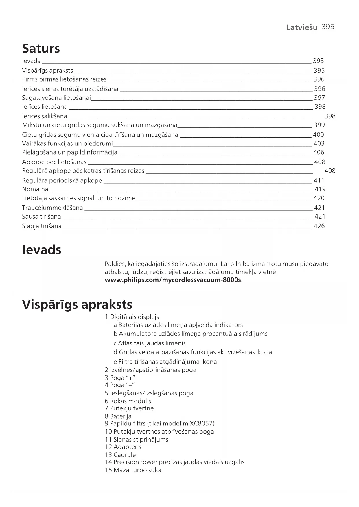 Latviešu Saturs Ievads ____________________________________________________________________________________ 395 Vispārīgs apraksts __________________________________________________________________________ 395 Pirms pirmās lietošanas reizes________________________________________________________________ 396 Ierīces sienas turētāja uzstādīšana ____________________________________________________________ 396 Sagatavošana lietošanai_____________________________________________________________________ 397 Ierīces lietošana ____________________________________________________________________________ 398 Ierīces salikšana ____________________________________________________________________________ 398 Mīkstu un cietu grīdas segumu sūkšana un mazgāšana__________________________________________ 399 Cietu grīdas segumu vienlaicīga tīrīšana un mazgāšana _________________________________________ 400 Vairākas funkcijas un piederumi______________________________________________________________ 403 Pielāgošana un papildinformācija ____________________________________________________________ 406 Apkope pēc lietošanas ______________________________________________________________________ 408 Regulārā apkope pēc katras tīrīšanas reizes ____________________________________________________ 408 Regulāra periodiskā apkope _________________________________________________________________ 411 Nomaiņa __________________________________________________________________________________ 419 Lietotāja saskarnes signāli un to nozīme_______________________________________________________ 420 Traucējummeklēšana _______________________________________________________________________ 421 Sausā tīrīšana ______________________________________________________________________________ 421 Slapjā tīrīšana______________________________________________________________________________ 426 Ievads Paldies, ka iegādājāties šo izstrādājumu! Lai pilnībā izmantotu mūsu piedāvāto atbalstu, lūdzu, reģistrējiet savu izstrādājumu tīmekļa vietnē www.philips.com/mycordlessvacuum-8000s. Vispārīgs apraksts 1 Digitālais displejs a Baterijas uzlādes līmeņa apļveida indikators b Akumulatora uzlādes līmeņa procentuālais rādījums c Atlasītais jaudas līmenis d Grīdas veida atpazīšanas funkcijas aktivizēšanas ikona e Filtra tīrīšanas atgādinājuma ikona 2 Izvēlnes/apstiprināšanas poga 3 Poga “+” 4 Poga “–” 5 Ieslēgšanas/izslēgšanas poga 6 Rokas modulis 7 Putekļu tvertne 8 Baterija 9 Papildu filtrs (tikai modelim XC8057) 10 Putekļu tvertnes atbrīvošanas poga 11 Sienas stiprinājums 12 Adapteris 13 Caurule 14 PrecisionPower precīzas jaudas viedais uzgalis 15 Mazā turbo suka396 Latviešu 16 Kombinētais uzgalis 17 Mīkstā suka 18 Polsterējumu uzgalis 19 Šaurās vietās ievietojams uzgalis 20 Sūkšanas un mazgāšanas uzgalis 21 Ūdens tvertne 22 Mikrošķiedras tīrīšanas paliktnis Pirms pirmās lietošanas reizes Ierīces sienas turētāja uzstādīšana 1 Pagrieziet sienas stiprinājumu un atbīdiet pelēko sviru. Ievietojiet uzlādes portu tā, lai ir redzama metāla daļa, un pavērsiet to vertikāli virzienā pret sānu stiprinājuma priekšpusi. 2 Sakārtojiet vadu, ievietojot to tam paredzētajā rievā. 3 Iebīdiet atpakaļ pelēko sviru. Pārliecinieties, vai pelēkā svira ir nostiprināta tai paredzētajā vietā, par ko liecina klikšķa skaņa. 110 ± 2 cm 4 Droši piestipriniet sienas stiprinājumu vēlamajā vietā pie sienas, nodrošinot, ka uzstādīšanas skrūves atveres atrodas aptuveni 110cm attālumā no grīdas. Uzmanību! Sienā urbjot sienas stiprinājumiem paredzētus caurumus, ievērojiet piesardzību, lai izvairītos no elektriskās strāvas trieciena riska.397 Latviešu Piezīme. Pārbaudiet, vai sienas stiprinājums ir novietots tā, ka visa ierīce ir piekārta pie sienas un uzgalis nepieskaras grīdai. 5 Kad ir noteikts optimāls ierīces glabāšanas un uzlādes izvietojums un augstums, stingri pievelciet skrūves, lai piestiprinātu sienas stiprinājumu tam paredzētajā vietā. Sagatavošana lietošanai Ierīce ir aprīkota ar litija jonu akumulatoru. Pilnīga akumulatora uzlāde ilgst līdz pat 6stundas. 1 Pievienojiet akumulatoru komplektu ierīces galvenajam korpusam, nodrošinot, ka tas tiek stingri pievienots, par ko liecina klikšķa skaņa. MAX 40⁰C MIN 5⁰C 2 Uzlādējiet ierīci, novietojot to uz saliktā sienas stiprinājuma. Brīdinājums! Uzglabājiet un uzlādējiet ierīci 5°C–40°C temperatūrā.398 Latviešu Piezīme. Varat arī novietot rokas moduli uz līdzenas un stabilas virsmas un tieši pievienot uzlādes vadu ierīcei.