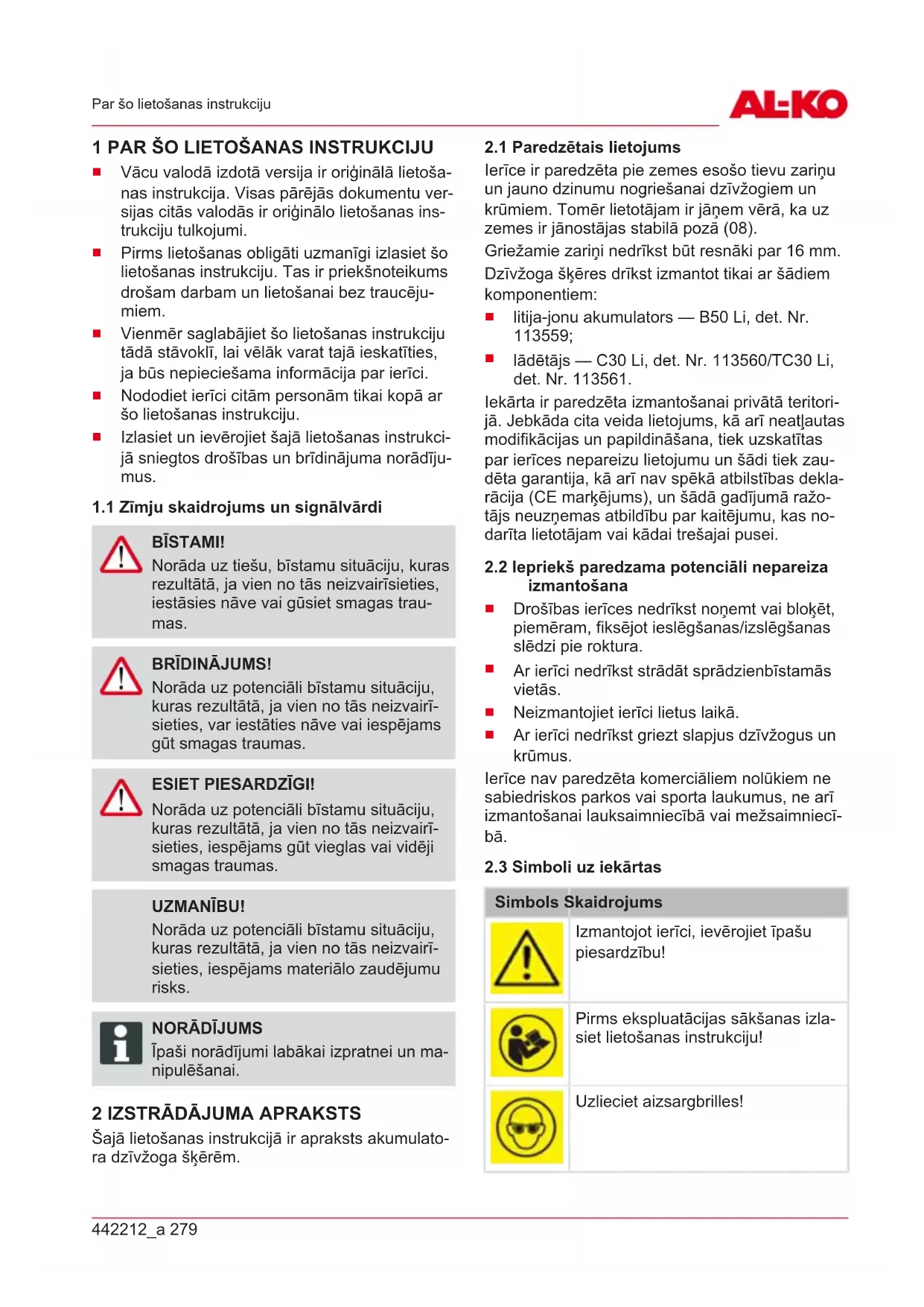 lādētājs— C30 Li, det. Nr. 113560/TC30 Li, det. Nr. 113561. Iekārta ir paredzēta izmantošanai privātā teritori- jā. Jebkāda cita veida lietojums, kā arī neatļautas modifikācijas un papildināšana, tiek uzskatītas par ierīces nepareizu lietojumu un šādi tiek zau- dēta garantija, kā arī nav spēkā atbilstības dekla- rācija (CE marķējums), un šādā gadījumā ražo- tājs neuzņemas atbildību par kaitējumu, kas no- darīta lietotājam vai kādai trešajai pusei.