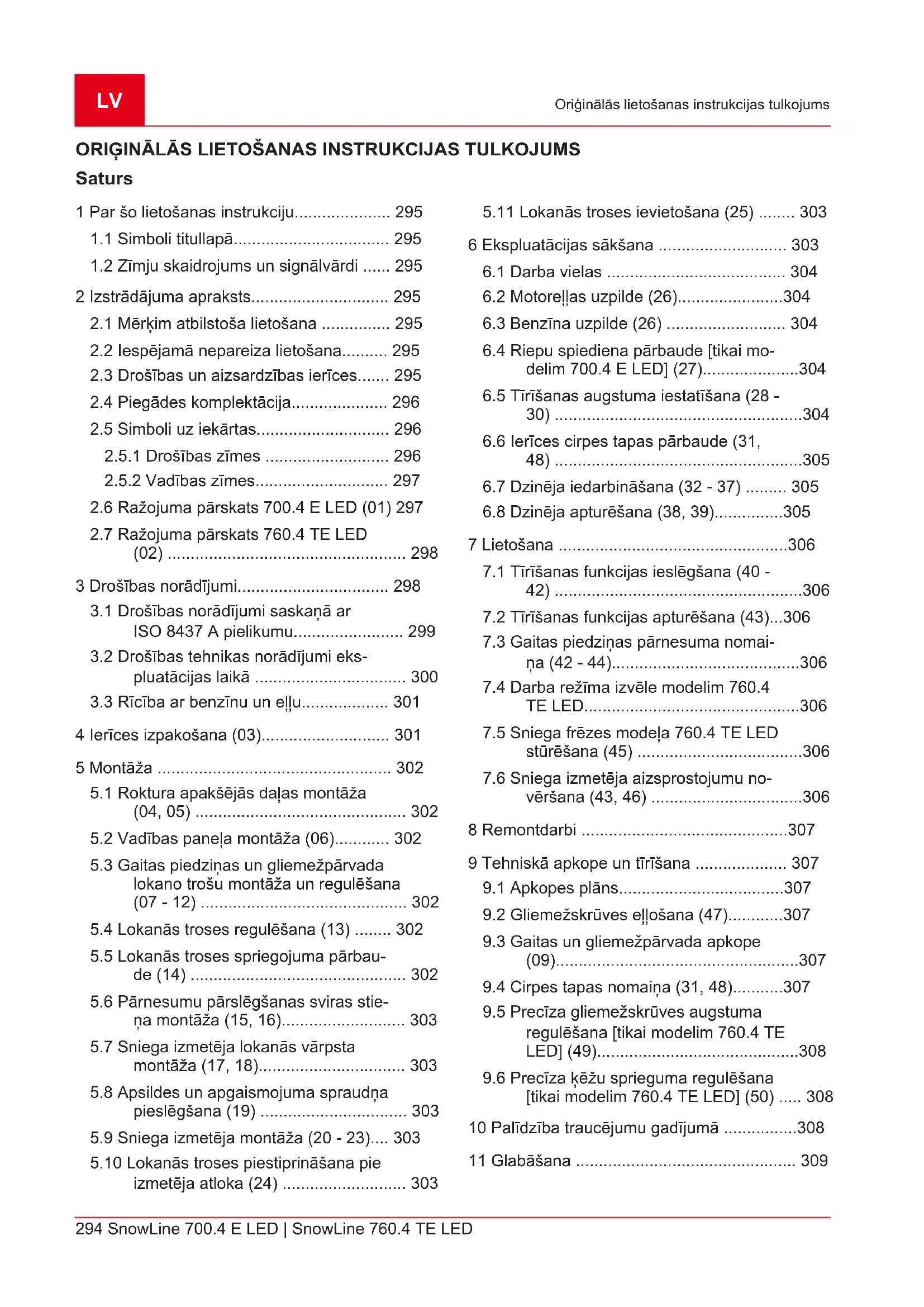 Īpašnieka un ierīces drošības labad pēc glie- mežskrūves bloķēšanas cirpes tapas (31/1) var tikt nogrieztas. NORĀDĪJUMS Nogrieztas cirpes tapas no- mainiet ar oriģinālajām rezerves daļām. Ja tiek iz- mantotas neatļautas rezerves daļas, ierīcei var rasties nopietni bojājumi!LV 308 SnowLine 700.4 E LED | SnowLine 760.4 TE LED Palīdzība traucējumu gadījumā