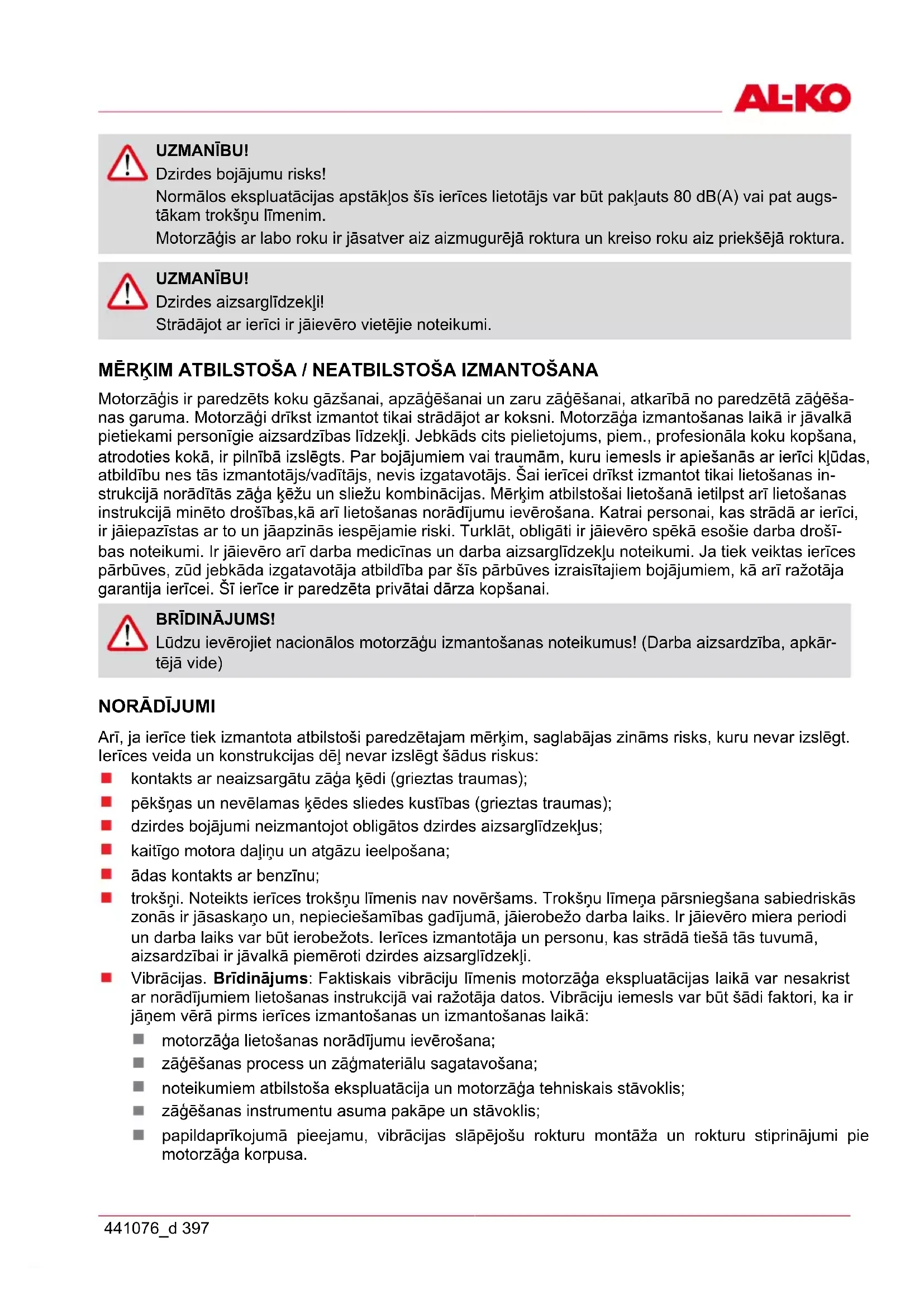 - EK ATBILSTĪBAS DEKLARĀCIJA UZMANĪBU! Pirms mūsu produktu izmantošanas lūdzam rūpīgi izlasīt šo lietošanas instrukciju, lai iepazītos ar ierīci. Uzglabājiet šo lietošanas instrukciju viegli pieejamā vietā. UZMANĪBU! Ar attiecīgu simbolu apzīmēti brīdinājuma norādījumi šajā lietošanas instrukcijā norāda uz kri- tiskiem punktiem, kas ir jāņem vērā, lai izvairītos no traumu gūšanas; izlasiet šos norādījumus rūpīgi un ņemiet tos vērā ierīces ekspluatācijas laikā. UZMANĪBU! Šis simbols apzīmē norādījumus, ka ir jāievēro, lai izvairītos no negadījumiem, kas var izraisīt traumas vai pat nāvi. UZMANĪBU! Šis simbols apzīmē norādījumus, ka ir jāievēro, lai izvairītos no mehāniskiem traucējumiem, atteikumiem vai bojājumiem. UZMANĪBU! Izlasiet šos norādījumus uzmanīgi, pirms sāciet strādāt ar zāģi un uzglabājiet tos viegli pieejamā vietā. Rūpīgi izlasiet norādījumus. Iepazīstieties ar vadības elementiem, lai spētu ierīci vadīt droši. Uzglabājiet šo lietošanas instrukciju kopā ar motorzāģi.441076_d 397 UZMANĪBU! Dzirdes bojājumu risks! Normālos ekspluatācijas apstākļos šīs ierīces lietotājs var būt pakļauts 80 dB(A) vai pat augs- tākam trokšņu līmenim. Motorzāģis ar labo roku ir jāsatver aiz aizmugurējā roktura un kreiso roku aiz priekšējā roktura. UZMANĪBU! Dzirdes aizsarglīdzekļi! Strādājot ar ierīci ir jāievēro vietējie noteikumi. MĒRĶIM ATBILSTOŠA / NEATBILSTOŠA IZMANTOŠANA Motorzāģis ir paredzēts koku gāzšanai, apzāģēšanai un zaru zāģēšanai, atkarībā no paredzētā zāģēša- nas garuma. Motorzāģi drīkst izmantot tikai strādājot ar koksni. Motorzāģa izmantošanas laikā ir jāvalkā pietiekami personīgie aizsardzības līdzekļi. Jebkāds cits pielietojums, piem., profesionāla koku kopšana, atrodoties kokā, ir pilnībā izslēgts. Par bojājumiem vai traumām, kuru iemesls ir apiešanās ar ierīci kļūdas, atbildību nes tās izmantotājs/vadītājs, nevis izgatavotājs. Šai ierīcei drīkst izmantot tikai lietošanas in- strukcijā norādītās zāģa ķēžu un sliežu kombinācijas. Mērķim atbilstošai lietošanā ietilpst arī lietošanas instrukcijā minēto drošības,kā arī lietošanas norādījumu ievērošana. Katrai personai, kas strādā ar ierīci, ir jāiepazīstas ar to un jāapzinās iespējamie riski. Turklāt, obligāti ir jāievēro spēkā esošie darba drošī- bas noteikumi. Ir jāievēro arī darba medicīnas un darba aizsarglīdzekļu noteikumi. Ja tiek veiktas ierīces pārbūves, zūd jebkāda izgatavotāja atbildība par šīs pārbūves izraisītajiem bojājumiem, kā arī ražotāja garantija ierīcei. Šī ierīce ir paredzēta privātai dārza kopšanai. BRĪDINĀJUMS! Lūdzu ievērojiet nacionālos motorzāģu izmantošanas noteikumus! (Darba aizsardzība, apkār- tējā vide) p. 418