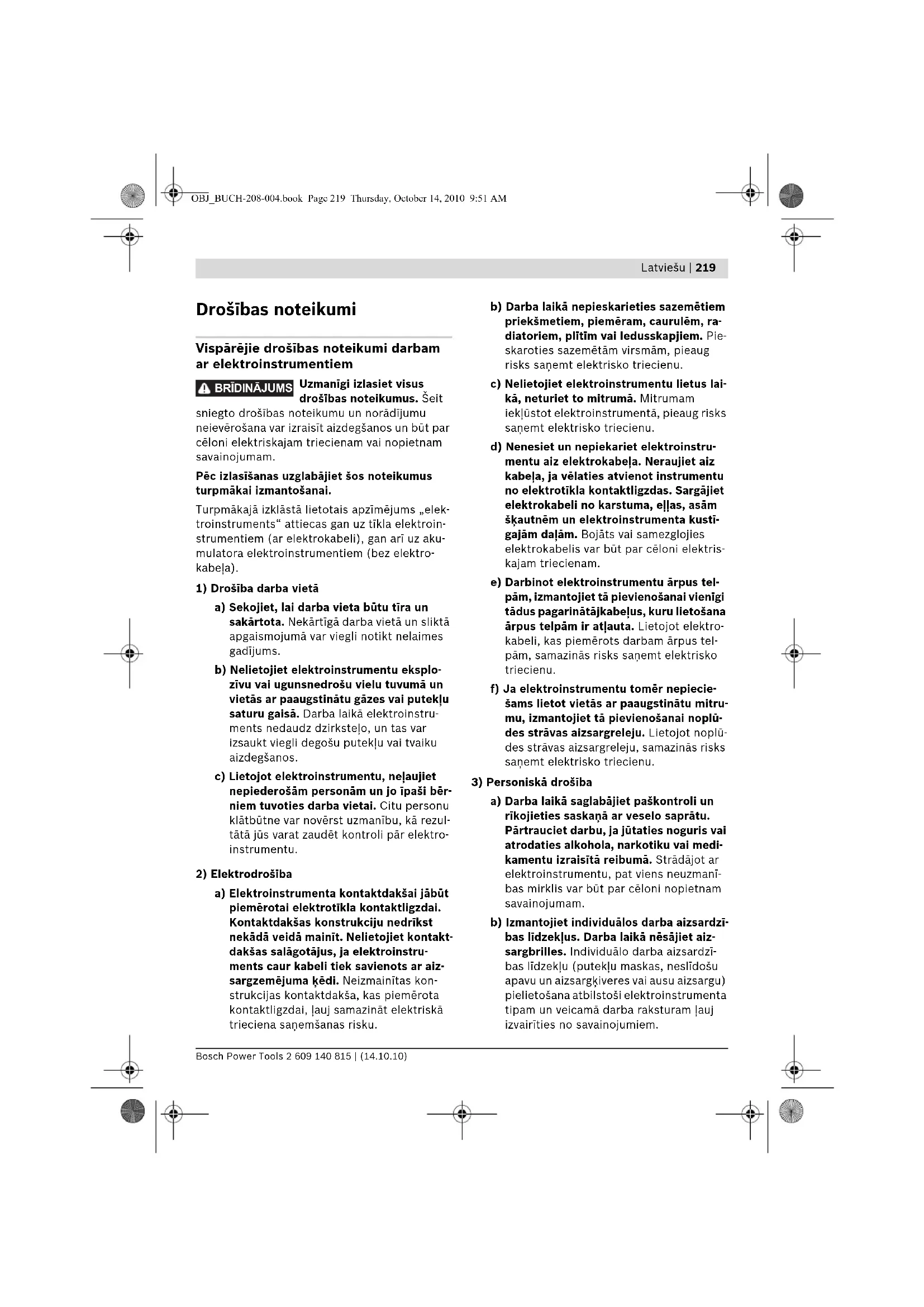 OBJ_BUCH-208-004.book Page 219 Thursday, October 14, 2010 9:51 AM220 | Latviešu 2 609 140 815 | (14.10.10) Bosch Power Tools c) Nepieļaujiet elektroinstrumenta patvaļī- gu ieslēgšanos. Pirms elektroinstrumen- ta pievienošanas elektrotīklam, akumu- latora ievietošanas vai izņemšanas, kā arī pirms elektroinstrumenta pārnešanas pārliecinieties, ka tas ir izslēgts. Pārne- sot elektroinstrumentu, ja pirksts atrodas uz ieslēdzēja, kā arī pievienojot to elektro- barošanas avotam laikā, kad elektro- instruments ir ieslēgts, var viegli notikt nelaimes gadījums. d) Pirms elektroinstrumenta ieslēgšanas neaizmirstiet izņemt no tā regulējošos instrumentus vai atslēgas. Regulējošais instruments vai atslēga, kas ieslēgšanas brīdī atrodas elektroinstrumenta kustīga- jās daļās, var radīt savainojumu. e) Darba laikā izvairieties ieņemt neērtu vai nedabisku ķermeņa stāvokli. Vienmēr ieturiet stingru stāju un centieties sagla- bāt līdzsvaru. Tas atvieglo elektroinstru- menta vadību neparedzētās situācijās. f) Izvēlieties darbam piemērotu apģērbu. Darba laikā nenēsājiet brīvi plandošas drēbes un rotaslietas. Netuviniet matus, apģērbu un aizsargcimdus elektroinstru- menta kustīgajām daļām. Elektroinstru- menta kustīgajās daļās var ieķerties vaļīgas drēbes, rotaslietas un gari mati. g) Ja elektroinstrumenta konstrukcija ļauj tam pievienot ārējo putekļu uzsūkšanas vai savākšanas/uzkrāšanas ierīci, seko- jiet, lai tā būtu pievienota un pareizi dar- botos. Pielietojot putekļu uzsūkšanu vai savākšanu/uzkrāšanu, samazinās to kaitīgā ietekme uz strādājošās personas veselību.