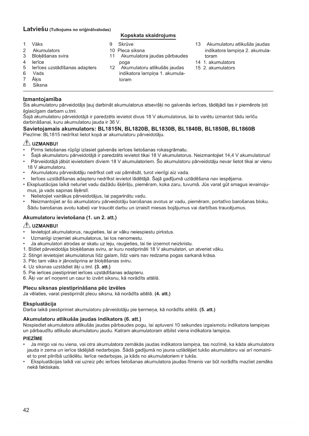 Akumulatoriemiriekšējāaizsargfunkcija,kasautomātiskipārtraucstrāvaspadevi,laipagarinātuakumulatoru darbmūžu.Jaierīcesekspluatācijaslaikārodasturpmākminētiegadījumi,motorsautomātiskipārstājdarboties, koizraisaakumulatoruaizsargfunkcijaunkasneliecinaparnepareizudarbību. Jaakumulatorujaudapalielināsvirsnoteiktalīmeņa,motorsautomātiskipārstājdarboties;tonevariedarbinātpat tad,jatieknospiestsiedarbināšanasslēdzis.Šādāgadījumāpārtraucietakumulatoruekspluatāciju,izņemiettos noBCV01unnogaidiet,līdzakumulatoriatdziest,vaiarīuzlādējiettos. Jaakumulatoriirizlādējušies,ierīcesmotorsautomātiskipārstājdarboties.Jaierīcenedarbojaspattad,jato mēģinaiedarbinātarslēdžapalīdzību,izņemietakumulatorusnoBCV01unuzlādējiettos. 4.BCV01neparastiaugstaspriegumakonstatēšana JaBCV01konstatēakumulatorosneparastiaugstuspriegumu,motorsautomātiskipārstājdarboties.Toizraisa BCV01aizsargfunkcijauntasneliecinaparnepareizudarbību.Šādāgadījumāmotorsnedarbojaspattad,jaierīci mēģinaiedarbinātarslēdžapalīdzību. IzņemietnoBCV01akumulatorusunievietojiettovietācitus,kuriemirpareizsspriegums. PIEZĪME Ja ierīce automātiski pārstāj darboties un BCV01 indikators neko nenorāda Jaierīceirodaspārslodze,automātiskitiekpārtrauktastrāvaspadeve,laipagarinātuakumulatorudarbmūžu.To izraisaakumulatoruaizsargfunkcijauntasneliecinaparnepareizudarbību.TurklātšādāgadījumāBCV01indikators nekonenorāda,bettasneliecinaparnepareizudarbību.Jatānotiek,atlaidietslēdziunnovērsietpārslodzescēloni. Kadtasizdarīts,ierīcivarnojaunaiedarbinātarslēdžapalīdzību.45 1 Kaas 2 Aku 3 Lukustuslüliti 4 Seade 5 Seadmega ühendatav adapter 6 Juhe 7 Haak 8 Vöö 9 Kruvi 10 Õlarihm 11 Aku laetuse taseme kuvamise nupp 12 Aku 1 laetuse taseme indikaator 13 Aku 2 laetuse taseme indikaator 14 Aku 1 15 Aku 2 Eesti keeles (kasutusjuhendi tõlge) Piltide selgitused Kasutusvaldkonnad Selle akumuunduri abil saab lahutada põhiüksuse ja akud, mistõttu sobib see hästi pikaajalisi tööperioode nõudvate tööde jms puhul. Akumuunduris kasutatakse kahte 18 V akut ning seda saab kasutada 36 V akutoitel töötavates seadmetes. Ühilduv aku: BL1815N, BL1820B, BL1830B, BL1840B, BL1850B, BL1860B Märkus: Akut BL1815 ei saa akumuunduriga kasutada. ETTEVAATUST!