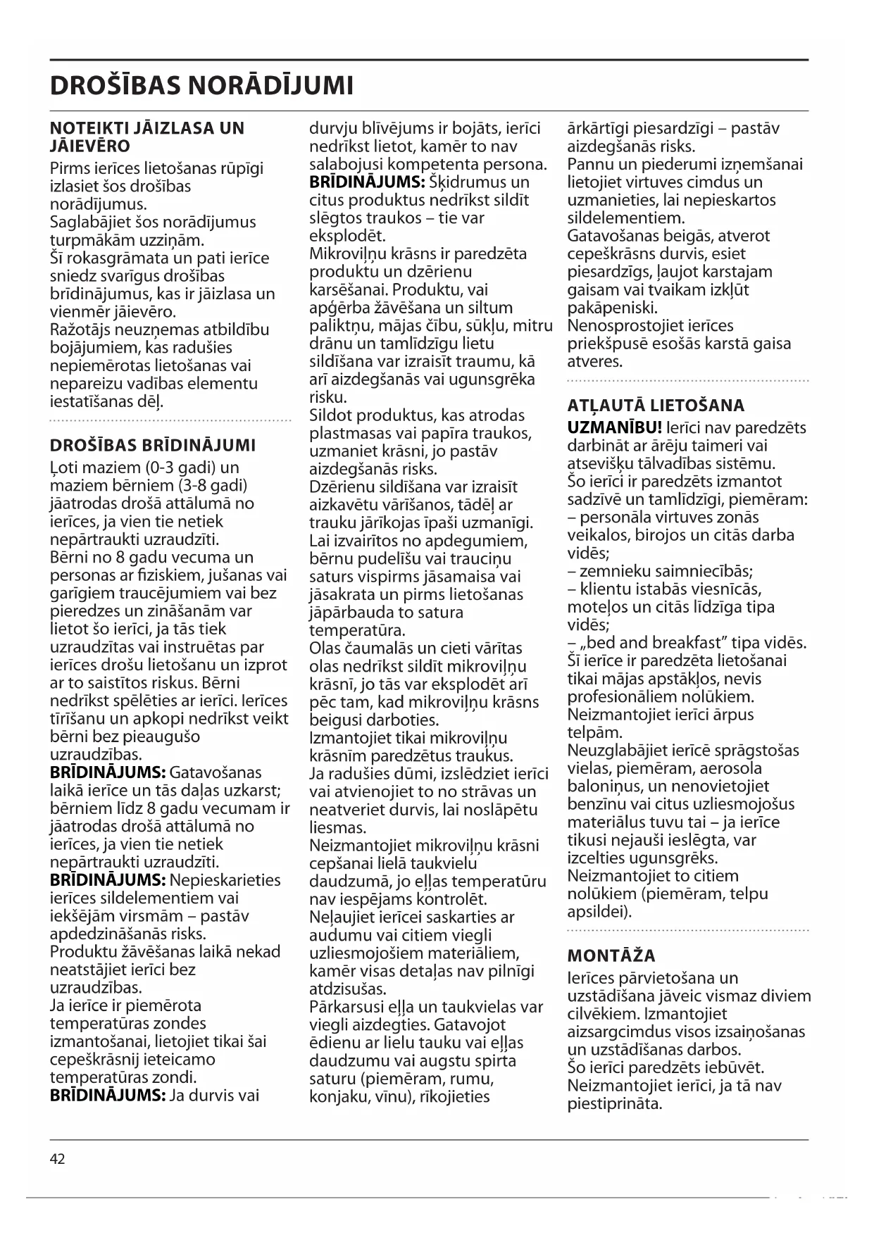 Ļoti maziem (0-3 gadi) un maziem bērniem (3-8 gadi) jāatrodas drošā attālumā no ierīces, ja vien tie netiek nepārtraukti uzraudzīti. Bērni no 8 gadu vecuma un personas ar fiziskiem, jušanas vai garīgiem traucējumiem vai bez pieredzes un zināšanām var lietot šo ierīci, ja tās tiek uzraudzītas vai instruētas par ierīces drošu lietošanu un izprot ar to saistītos riskus. Bērni nedrīkst spēlēties ar ierīci. Ierīces tīrīšanu un apkopi nedrīkst veikt bērni bez pieaugušo uzraudzības. BRĪDINĀJUMS: Gatavošanas laikā ierīce un tās daļas uzkarst; bērniem līdz 8 gadu vecumam ir jāatrodas drošā attālumā no ierīces, ja vien tie netiek nepārtraukti uzraudzīti. BRĪDINĀJUMS: Nepieskarieties ierīces sildelementiem vai iekšējām virsmām – pastāv apdedzināšanās risks. Produktu žāvēšanas laikā nekad neatstājiet ierīci bez uzraudzības. Ja ierīce ir piemērota temperatūras zondes izmantošanai, lietojiet tikai šai cepeškrāsnij ieteicamo temperatūras zondi. BRĪDINĀJUMS: Ja durvis vai durvju blīvējums ir bojāts, ierīci nedrīkst lietot, kamēr to nav salabojusi kompetenta persona. BRĪDINĀJUMS: Šķidrumus un citus produktus nedrīkst sildīt slēgtos traukos – tie var eksplodēt. Mikroviļņu krāsns ir paredzēta produktu un dzērienu karsēšanai. Produktu, vai apģērba žāvēšana un siltum paliktņu, mājas čību, sūkļu, mitru drānu un tamlīdzīgu lietu sildīšana var izraisīt traumu, kā arī aizdegšanās vai ugunsgrēka risku. Sildot produktus, kas atrodas plastmasas vai papīra traukos, uzmaniet krāsni, jo pastāv aizdegšanās risks. Dzērienu sildīšana var izraisīt aizkavētu vārīšanos, tādēļ ar trauku jārīkojas īpaši uzmanīgi. Lai izvairītos no apdegumiem, bērnu pudelīšu vai trauciņu saturs vispirms jāsamaisa vai jāsakrata un pirms lietošanas jāpārbauda to satura temperatūra. Olas čaumalās un cieti vārītas olas nedrīkst sildīt mikroviļņu krāsnī, jo tās var eksplodēt arī pēc tam, kad mikroviļņu krāsns beigusi darboties. Izmantojiet tikai mikroviļņu krāsnīm paredzētus traukus. Ja radušies dūmi, izslēdziet ierīci vai atvienojiet to no strāvas un neatveriet durvis, lai noslāpētu liesmas. Neizmantojiet mikroviļņu krāsni cepšanai lielā taukvielu daudzumā, jo eļļas temperatūru nav iespējams kontrolēt. Neļaujiet ierīcei saskarties ar audumu vai citiem viegli uzliesmojošiem materiāliem, kamēr visas detaļas nav pilnīgi atdzisušas. Pārkarsusi eļļa un taukvielas var viegli aizdegties. Gatavojot ēdienu ar lielu tauku vai eļļas daudzumu vai augstu spirta saturu (piemēram, rumu, konjaku, vīnu), rīkojieties ārkārtīgi piesardzīgi – pastāv aizdegšanās risks. Pannu un piederumi izņemšanai lietojiet virtuves cimdus un uzmanieties, lai nepieskartos sildelementiem. Gatavošanas beigās, atverot cepeškrāsns durvis, esiet piesardzīgs, ļaujot karstajam gaisam vai tvaikam izkļūt pakāpeniski. Nenosprostojiet ierīces priekšpusē esošās karstā gaisa atveres.