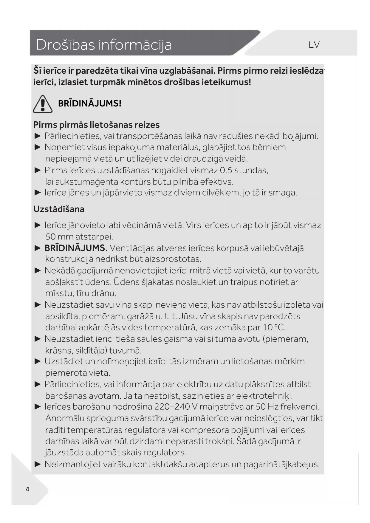 BRĪDINĀJUMS! Pirms pirmās lietošanas reizes ► Pārliecinieties, vai transportēšanas laikā nav radušies nekādi bojājumi. ► Noņemiet visus iepakojuma materiālus, glabājiet tos bērniem nepieejamā vietā un utilizējiet videi draudzīgā veidā. ► Pirms ierīces uzstādīšanas nogaidiet vismaz 0,5 stundas, lai aukstumaģenta kontūrs būtu pilnībā efektīvs. ► Ierīce jānes un jāpārvieto vismaz diviem cilvēkiem, jo tā ir smaga. Uzstādīšana ► Ierīce jānovieto labi vēdināmā vietā. Virs ierīces un ap to ir jābūt vismaz 50 mm atstarpei. ► BRĪDINĀJUMS. Ventilācijas atveres ierīces korpusā vai iebūvētajā konstrukcijā nedrīkst būt aizsprostotas. ► Nekādā gadījumā nenovietojiet ierīci mitrā vietā vai vietā, kur to varētu apšļakstīt ūdens. Ūdens šļakatas noslaukiet un traipus notīriet ar mīkstu, tīru drānu. ► Neuzstādiet savu vīna skapi nevienā vietā, kas nav atbilstošu izolēta vai apsildīta, piemēram, garāžā u. t. t. Jūsu vīna skapis nav paredzēts darbībai apkārtējās vides temperatūrā, kas zemāka par 10 °C. ► Neuzstādiet ierīci tiešā saules gaismā vai siltuma avotu (piemēram, krāsns, sildītāja) tuvumā. ► Uzstādiet un nolīmeņojiet ierīci tās izmēram un lietošanas mērķim piemērotā vietā. ► Pārliecinieties, vai informācija par elektrību uz datu plāksnītes atbilst barošanas avotam. Ja tā neatbilst, sazinieties ar elektrotehniķi. ► Ierīces barošanu nodrošina 220–240 V maiņstrāva ar 50 Hz frekvenci. Anormālu sprieguma svārstību gadījumā ierīce var neieslēgties, var tikt radīti temperatūras regulatora vai kompresora bojājumi vai ierīces darbības laikā var būt dzirdami neparasti trokšņi. Šādā gadījumā ir jāuzstāda automātiskais regulators. ► Neizmantojiet vairāku kontaktdakšu adapterus un pagarinātājkabeļus.LV Drošības informācija