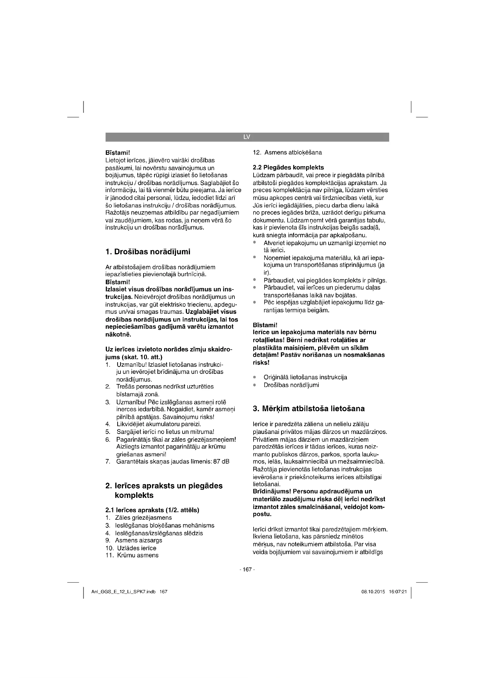 izmantošana Ierīce atrodas iepakojumā, lai izvairītos no bojājumiem transportēšanas laikā. Iepakojums ir izejmateriāls un to var izmantot atkārtoti vai nodot izejvielu apritē. Ierīce un tās piederumi ir no dažādiem materiāliem, piemēram, metāla un plastmasas. Bojātas detaļas nav sadzīves atkri- tumi. Lai nodrošinātu tehniski pareizu utilizāciju, ierīce jānodod attiecīgā savākšanas vietā. Ja Jums nav zināma šāda savākšanas vieta, jautājiet pašvaldībā. Anl_GGS_E_12_Li_SPK7.indb 170Anl_GGS_E_12_Li_SPK7.indb 170 08.10.2015 16:07:2108.10.2015 16:07:21LV