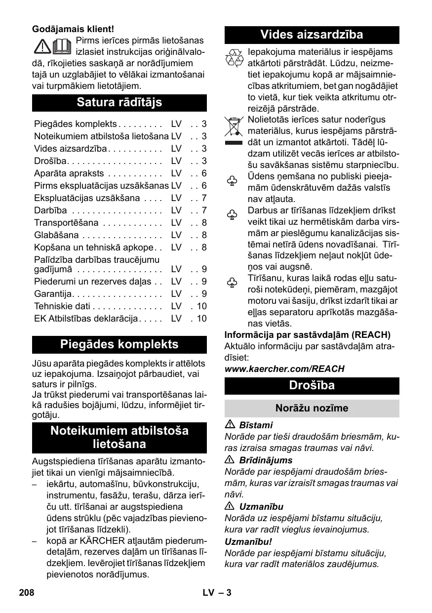 Piegādes komplekts Jūsu aparāta piegādes komplekts ir attēlots uz iepakojuma. Izsaiņojot pārbaudiet, vai saturs ir pilnīgs. Ja trūkst piederumi vai transportēšanas laikā radušies bojājumi, lūdzu, informējiet tirgotāju. Noteikumiem atbilstoša lietošana Augstspiediena tīrīšanas aparātu izmantojiet tikai un vienīgi mājsaimniecībā. – iekārtu, automašīnu, būvkonstrukciju, instrumentu, fasāžu, terašu, dārza ierīču utt. tīrīšanai ar augstspiediena ūdens strūklu (pēc vajadzības pievienojot tīrīšanas līdzekli). – kopā ar KÄRCHER atļautām piederumdetaļām, rezerves daļām un tīrīšanas līdzekļiem. Ievērojiet tīrīšanas līdzekļiem pievienotos norādījumus.