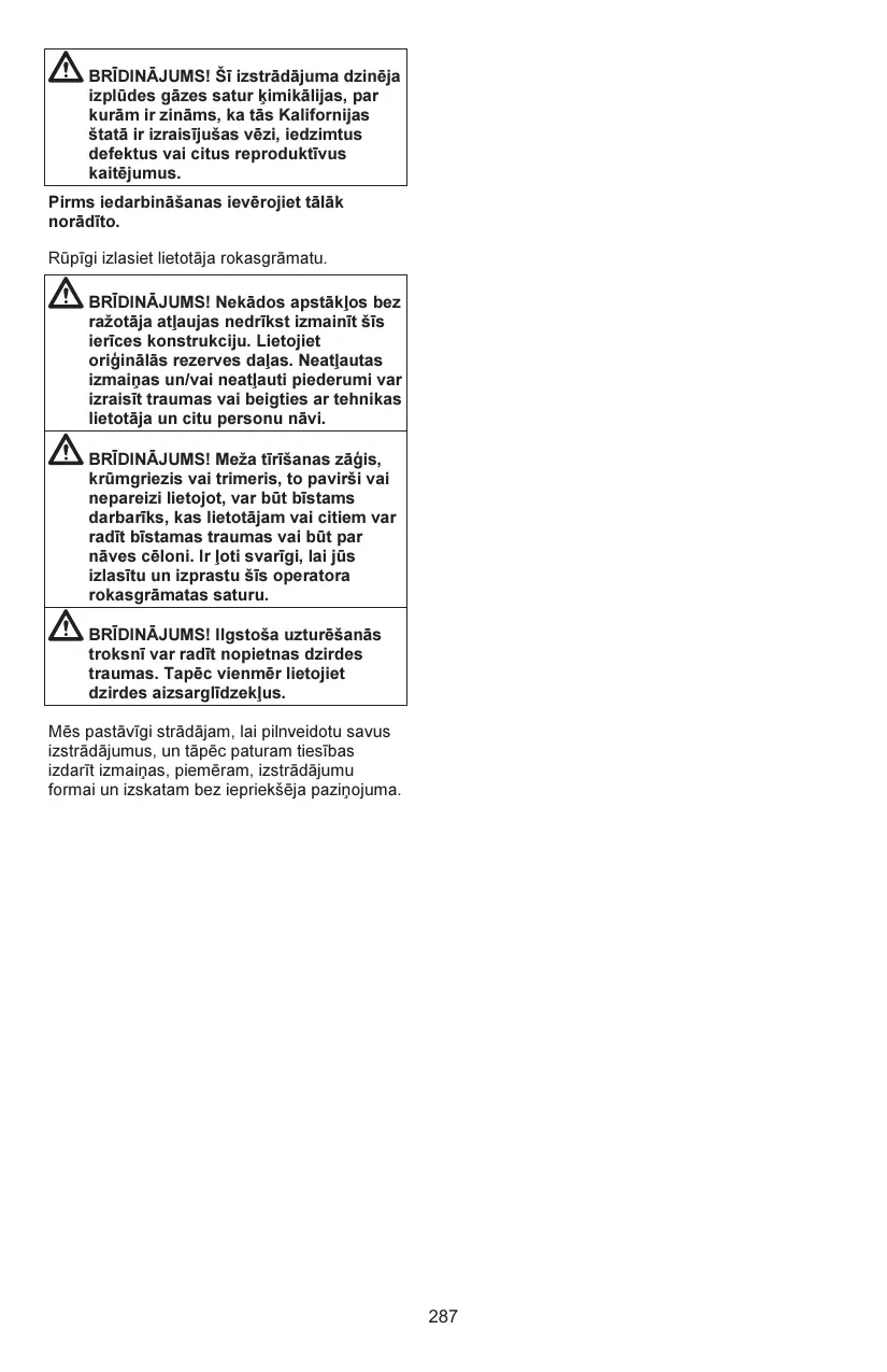 BRĪDINĀJUMS! Šī izstrādājuma dzinēja izplūdes gāzes satur ķimikālijas, par kurām ir zināms, ka tās Kalifornijas štatā ir izraisījušas vēzi, iedzimtus defektus vai citus reproduktīvus kaitējumus. Pirms iedarbināšanas ievērojiet tālāk norādīto. Rūpīgi izlasiet lietotāja rokasgrāmatu. BRĪDINĀJUMS! Nekādos apstākļos bez ražotāja atļaujas nedrīkst izmainīt šīs ierīces konstrukciju. Lietojiet oriģinālās rezerves daļas. Neatļautas izmaiņas un/vai neatļauti piederumi var izraisīt traumas vai beigties ar tehnikas lietotāja un citu personu nāvi. BRĪDINĀJUMS! Meža tīrīšanas zāģis, krūmgriezis vai trimeris, to pavirši vai nepareizi lietojot, var būt bīstams darbarīks, kas lietotājam vai citiem var radīt bīstamas traumas vai būt par nāves cēloni. Ir ļoti svarīgi, lai jūs izlasītu un izprastu šīs operatora rokasgrāmatas saturu. BRĪDINĀJUMS! Ilgstoša uzturēšanās troksnī var radīt nopietnas dzirdes traumas. Tapēc vienmēr lietojiet dzirdes aizsarglīdzekļus. Mēs pastāvīgi strādājam, lai pilnveidotu savus izstrādājumus, un tāpēc paturam tiesības izdarīt izmaiņas, piemēram, izstrādājumu formai un izskatam bez iepriekšēja paziņojuma.