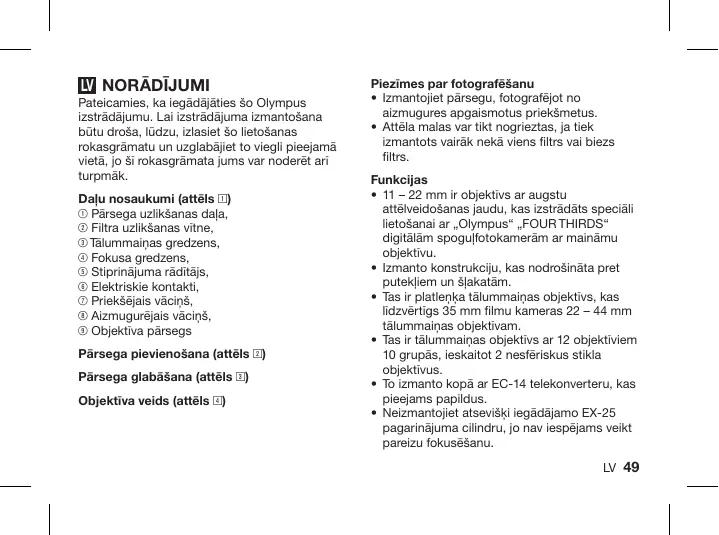 Téléchargez la notice de votre Fotokamera objektīvs au format PDF gratuitement ! Retrouvez votre notice ZUIKO DIGITAL 11-22 MM 1:2.8-3.5 - OLYMPUS et reprennez votre appareil électronique en main. Sur cette page sont publiés tous les documents nécessaires à l'utilisation de votre appareil ZUIKO DIGITAL 11-22 MM 1:2.8-3.5 de la marque OLYMPUS.