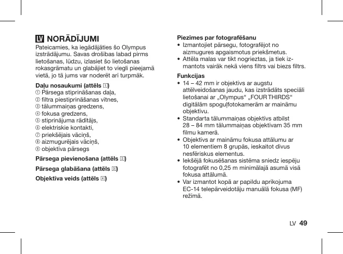 Piezīmes par fotografēšanu • Izmantojiet pārsegu, fotografējot no aizmugures apgaismotus priekšmetus. • Attēla malas var tikt nogrieztas, ja tiek izmantots vairāk nekā viens filtrs vai biezs filtrs. Funkcijas • 14 – 42 mm ir objektīvs ar augstu attēlveidošanas jaudu, kas izstrādāts speciāli lietošanai ar „Olympus“ „FOUR THIRDS“ digitālām spoguļfotokamerām ar maināmu objektīvu. • Standarta tālummaiņas objektīvs atbilst 28 – 84 mm tālummaiņas objektīvam 35 mm filmu kamerā. • Objektīvs ar maināmu fokusa attālumu ar 10 elementiem 8 grupās, ieskaitot divus nesfēriskus elementus. • Iekšējā fokusēšanas sistēma sniedz iespēju fotografēt no 0,25 m minimālajā asumā visā fokusa attālumā. • Var izmantot kopā ar papildu aprīkojuma EC-14 telepārveidotāju manuālā fokusa (MF) režīmā.